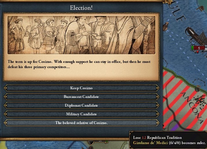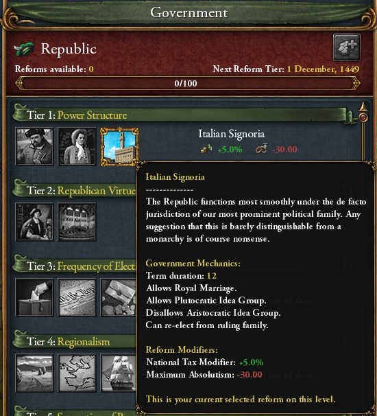 Florenceは特殊な共和制であるイタリア僭主制を採用している.統治者の再選による爆発的なパワーを持たないとか,婚姻ができるとか,中身はほとんど君主制である.程々の君主点を出しつつ共和制伝統によるボーナスで政府改革を進めやすいのが強みだろうか.