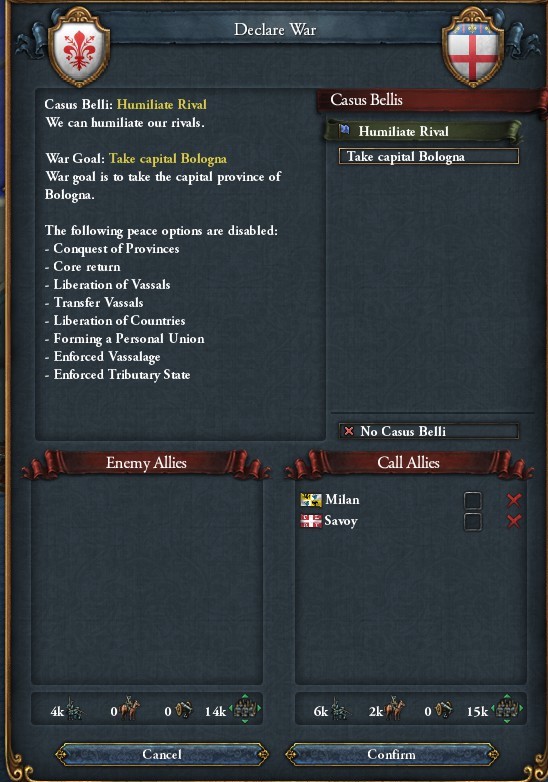 対Bologna戦は首都を落として1446/03に和平.