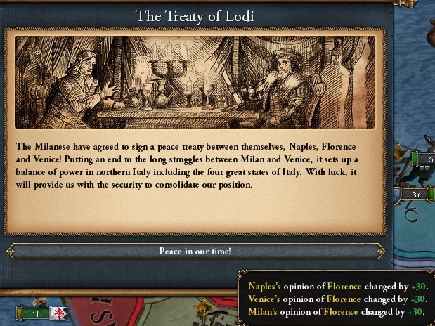 Ferraraから個別和平で1州,Tha Papal Stateから1州を奪って終戦した.Naplesにも1州渡しておく.