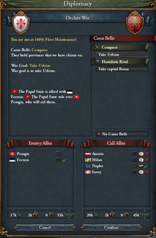 同盟国の少ないThe Papal Stateに宣戦布告.土地を約束してNaplesにも来てもらう.