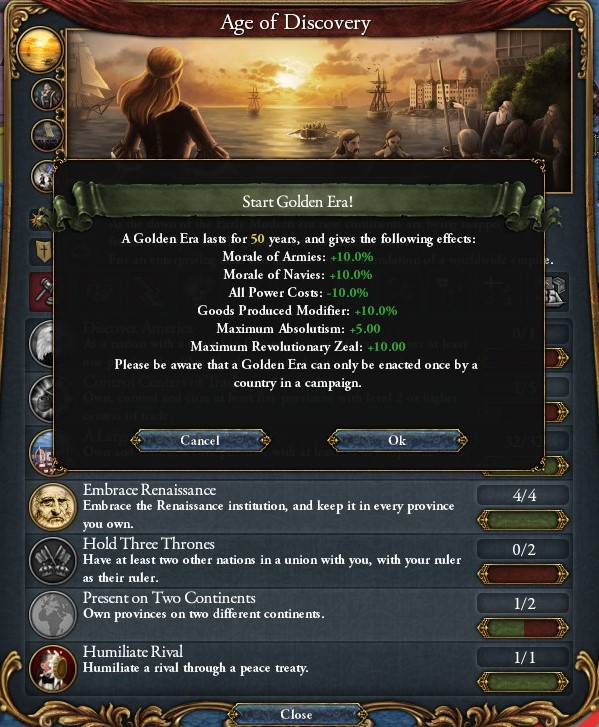 内政に強力なブーストがかかり,軍量と軍質も一応は強化される.全体としては優秀な部類だと思うのだが,唯一,伝統の教皇影響度+2/年だけが腐りやすい.立地からThe Papal Stateにライバル指定されやすく(今回もされている),友好度が-200に貼りつくせいで教皇影響度が増えなくなるし,隣接すればすぐに破門される.ドイツ諸侯が同じNIを持っていたら評価も変わったと思うのだが….