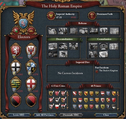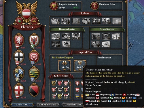 この後もHREに残っていると威信などにペナルティを受けるのだが,これはHRE皇帝と同盟していると回避できる.
