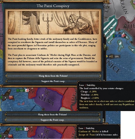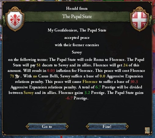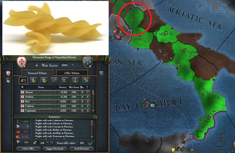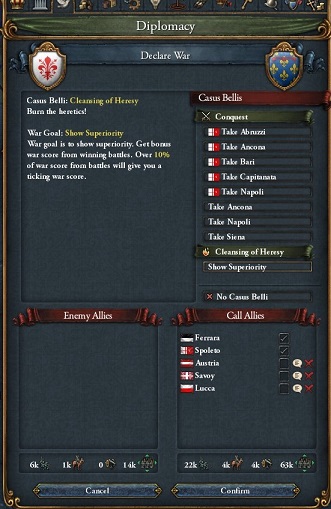 先の戦争でThe Papal Stateが弱体化→SienaがThe Papal Stateを殴る→NaplesがSienaを殴る,という流れでNaplesがFlorenceと隣接し,そのままFlorenceの領土を狙ってきたらしい.