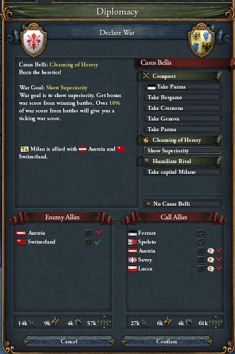 Milanに宣戦布告.敵同盟のAustriaとは一緒に対Castile戦を戦っているので,介入される心配はない.