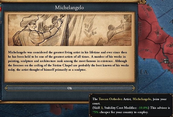 75 %割引の顧問としてミケランジェロが登場,当然雇う.