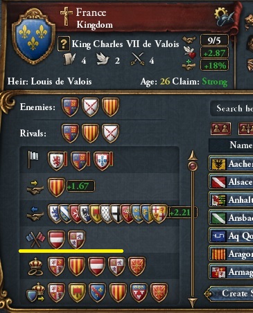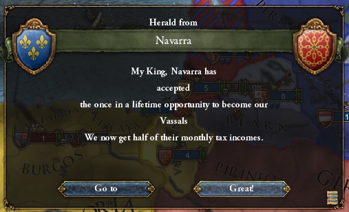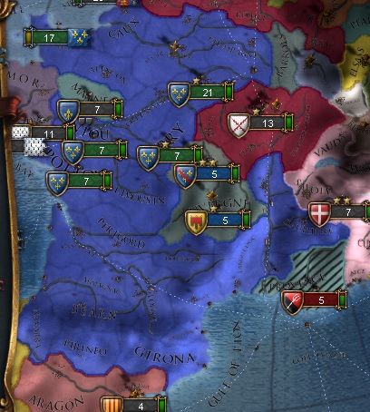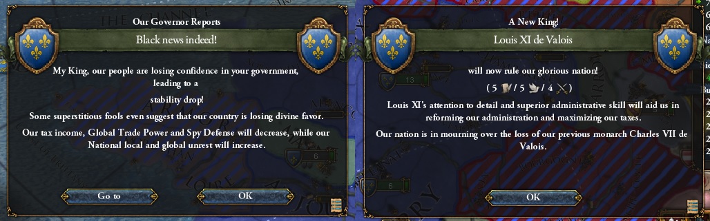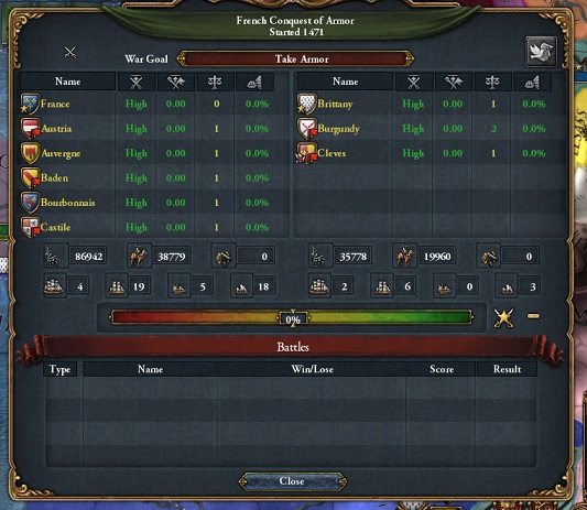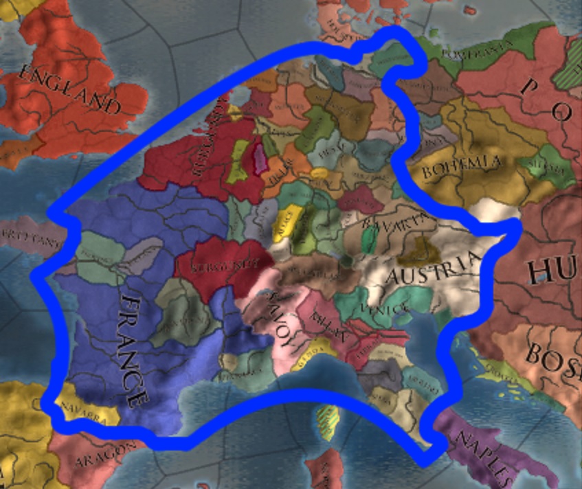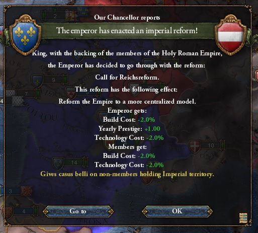 フランスがピレネー侵攻を完了させたとの知らせを受けたブルゴーニュ公国はフランス=オーストリア同盟の侵攻を恐れ混乱していた。チャールズ狡猾公は51連隊の兵を集め公国の存亡をかけた戦いに備えていた。しかし彼にとっては幸運か、ブルゴーニュの決戦の日は先送りにされる事となった。クリミア汗国がオスマン帝国を率いてジェノバ領に侵攻を開始したのである。神聖ローマ皇帝であるフリードリヒ3世はこれを保護すべくジェノバ側に立って参戦した。さらにこの帝国の混乱に乗じドイツ騎士団はポメラニア領に侵攻を開始し、フリードリヒ3世は同盟国フランスに参戦を要求した。衷情なシャルル7世はこの参戦要求に応え、援軍を派遣しようと試みたが、これはシャヤカ大帝により阻まれた。シャヤカ大帝はオーストリアとの同盟はあくまで対ブルゴーニュ戦を前提とする物であり、神聖ローマ帝国の戦争には関与する必要はないとした。またフランス=オーストリア同盟の成立によりこちらの動向を注視しているであろうブルゴーニュを目前として、フランス本土を手薄にするべきではないと考えた。シャルル国王はしぶしぶこれに同意し、援軍の派遣を断念した。フランスはオーストリアがこの戦争を終結させるまでは内政の強化に尽力し、ナヴァラを除くフランス南部を直轄統治することに成功した。またフリードリヒ3世はこの帝国防衛戦争を通して神聖ローマ諸侯の結束をより強固なものとし、帝国改革の実施に乗り出した。