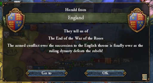 イングランドではエドワード6世の没後、プランタジネット朝が断絶しヨーク家とランカスター家による王位継承を巡る薔薇戦争が勃発していたが、この内戦は百年戦争でも活躍していた将軍家であるフェアファックス家により平定された。この内戦を平定したガイ=フェアファックスがイングランド王ガイ1世として即位し、ここにフェアファックス朝が成立した。シャルル7世はイングランド王国の伸長を警戒し、スコットランド王ジェームズ2世と接近し、対イングランド同盟の締結に成功している。またシャルル国王はこの間に、対イングランドを唱えフランス周辺諸侯の統制にも努めており、アヴィニョンとアンジューをその直轄領とした。