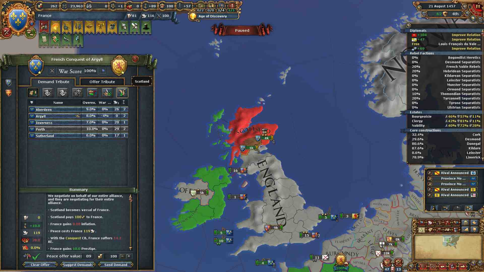 戦力差もあるので特に苦労もなくスコットランドの属国化に成功しました。
