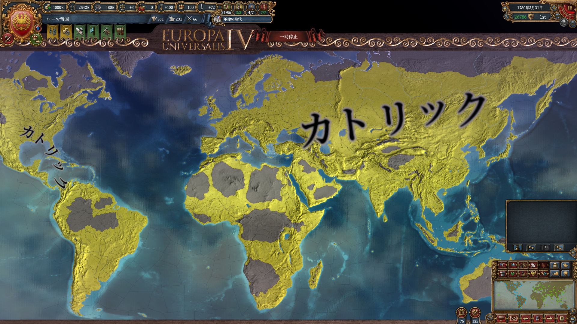 計画としては「絶対主義の時代までは高い国力・ミッション報酬・時代ボーナスで欧州を制圧し、革命の時代は宗教統一が望めそうならローマ帝国の高いCCR・統治効率でスマートな拡張を、難しそうなら革命フランスの圧倒的拡張力で全てを消滅させる」といったものです。