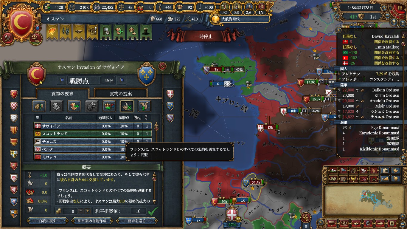 そしてブルゴーニュを同君下位にしたラスボスのフランスに停戦破棄して宣戦。