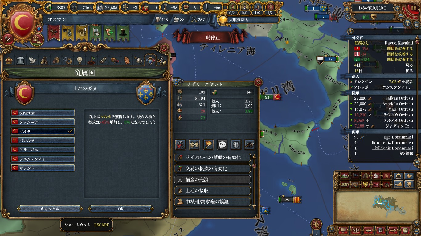 ただし、そのタイミングが1490以降だとコアエヤレト化が厳しいはずですので、属国移譲しない方が良いと思います。