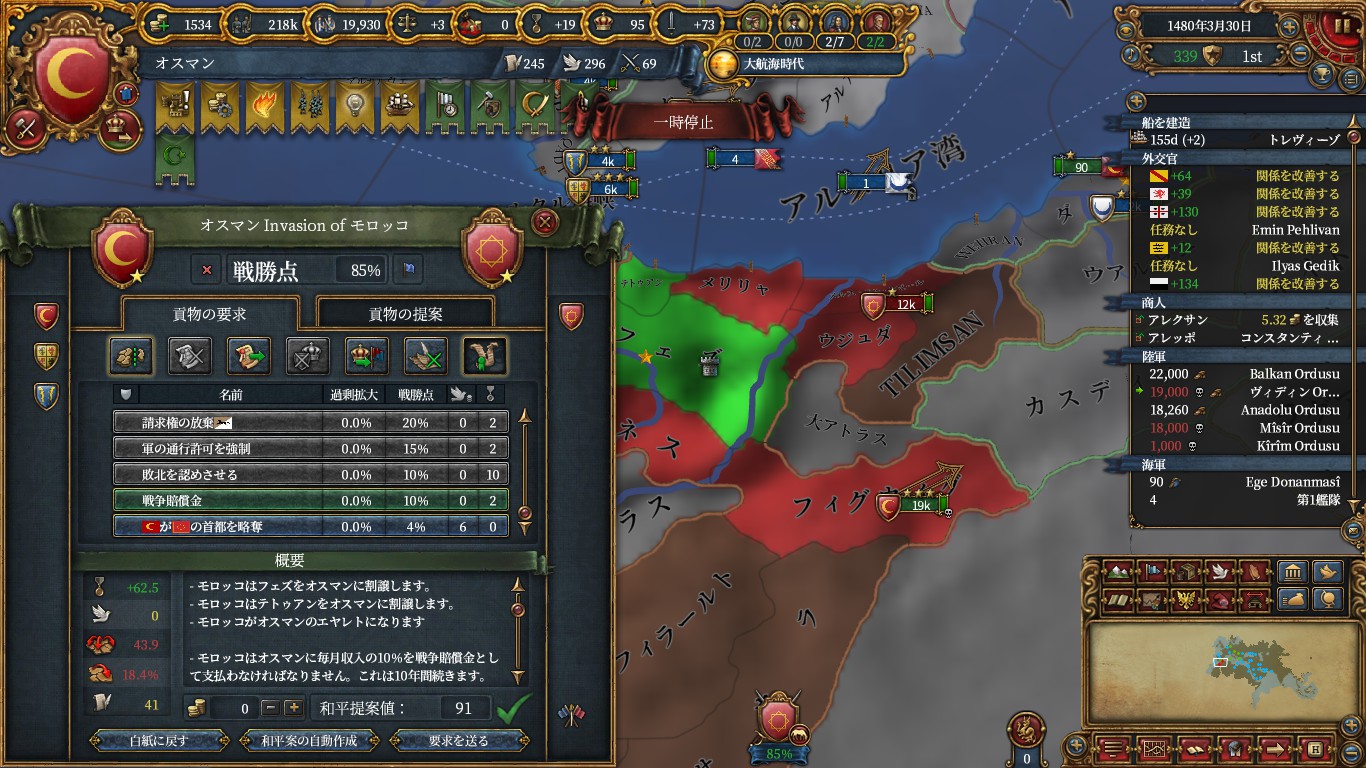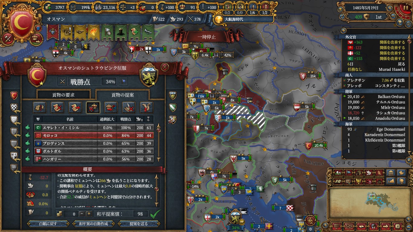 ついでに適当に宣戦していたミュンヘンに対し、モロッコなどの解放で敗北和平によるAEを減らしました。