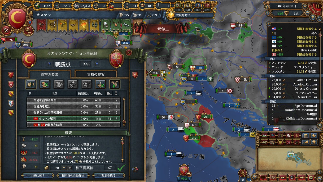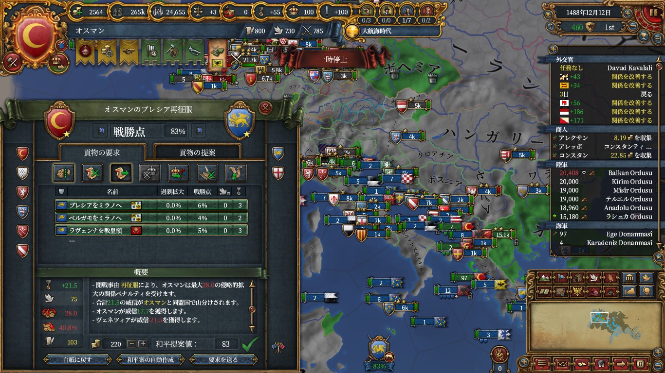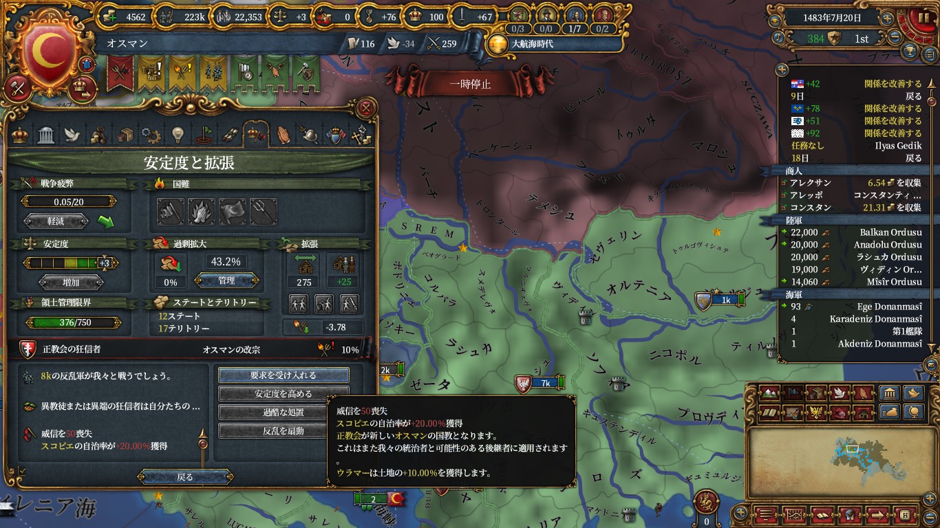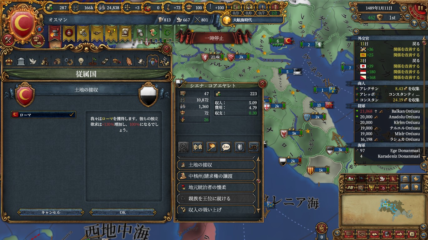 諜報最後の属国化受諾補正+15のおかげでミラノ・クロアチア・フィレンツェといったそこそこ大きい国を正教化すれば属国化が狙えます。