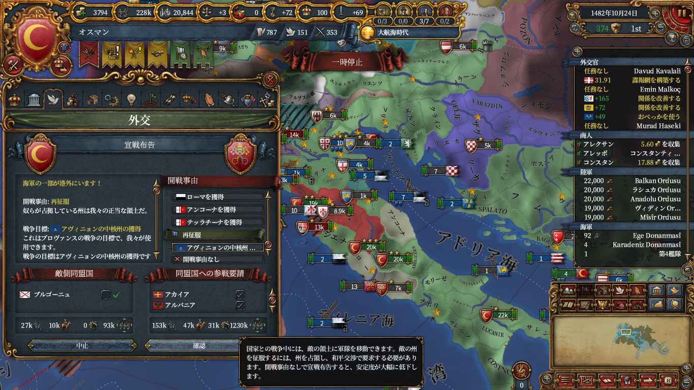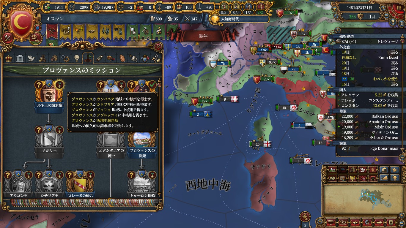プロヴァンスの総開発が100以上かコルシカを領有するとき、プロヴァンスがナポリを同君連合にできない状態のときにおいてナポリ方面にプロヴァンスのコアが生成されるので覚えておくと便利です。