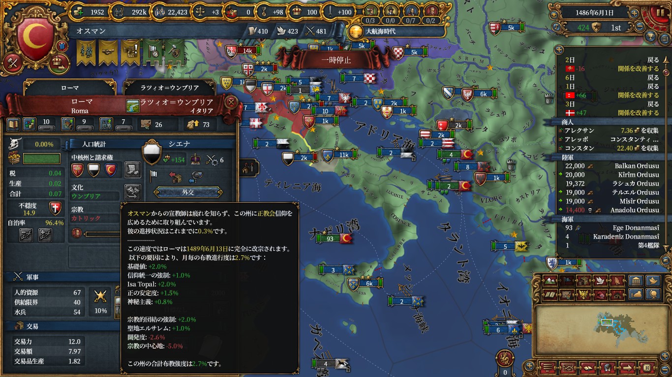 エルサレムモニュメントとイスラムディシジョンから異端改宗強度が増えたため、正教属国シエナのローマのカトリックから正教への改宗がとてもしやすくなっています。