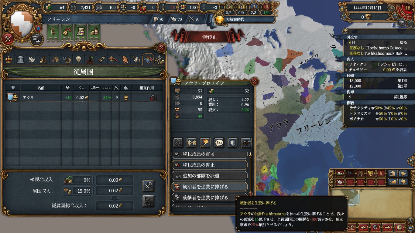 この仕様と未改革ナワトルの属国君主を生贄に捧げるコマンドを組み合わせることで、プロノイア即併合の裏技を紹介しようと思います。