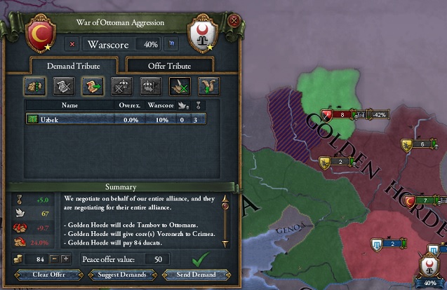 こうすれば基本キプチャク一国にオスマン・クリミア2国で殴り掛かるの図が作れるからあとはていとーに占領してモスクワ国境のプロビを奪えばオーケーだよー。