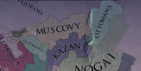 我が国は開始時モスクワ大公国は未発見状態ですので隣接プロビを得て自然発見されるのを待ちましょう。モスクワ発見を待っている間にアナトリアのコア州をさくっと回収しておくとなおよいでしょう。人的資源を温存するため傭兵のみで戦うのが得策かと思います。