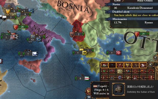 そのようですなぁ・・・。さて、モスクワさえ取ってしまえばSultan of Rumの実績は簡単です。コンスタンティノープルはミッションでクレームを得られますし、ローマは焦らず隙をついて敵に強国がついてこない機会をうかがってさくっと取ってしまいましょう。
