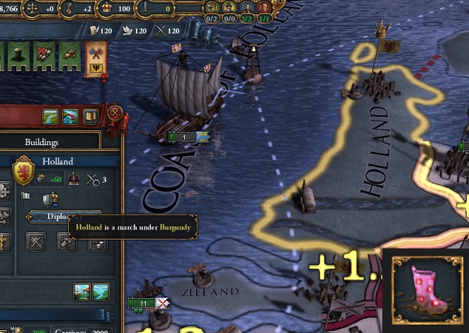 そうそう。それで沼地が密集してるところないかなーって思って探してたんだけど低地地方に沼地が3つあるじゃん?で、このうちの2つがどっちもホラントのコア州なんだけどここって1444年プレイ開始時両方ともブルゴーニュ公国の領土なわけじゃん?で別にブルゴーニュ開始時戦争もしてないわけじゃん?