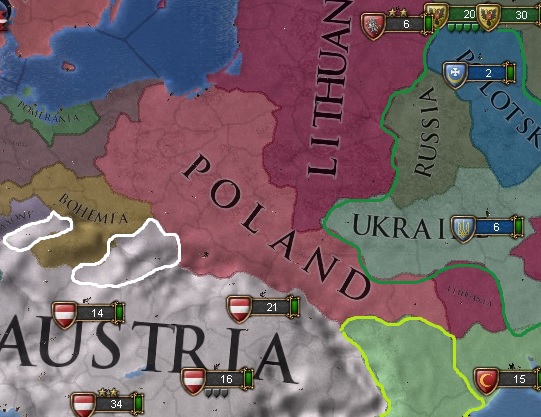 かつて、Austriaを2度にわたってボコってきた因縁のPoland=Lithuania=Bohemiaの3ヶ国同盟に