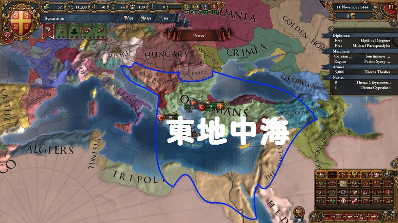 &ref(): File not found: "jpg" at page "AAR/ローマの平和よ再び/ローマの平和1"; 東ローマ帝国はその名の通りかつて地中海全域を支配したローマ帝国の東半分です。つまり東地中海を包み込むような形をしていました。私は生前かつてのローマ帝国の版図を求めて大遠征を行いイタリア、トリポリ、チュニジア、そしてイベリア半島の南端を支配しました。これが東ローマ帝国の最大版図と言われています。
