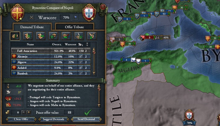 1765年まで再度のロシアとの戦争に苦戦していたフランスはカソリックの信仰の守護者の地位を失っていた。しかしこれをフランスのカソリック国の保護義務が消えた好機と見たビザンツ帝国は1766年東西ローマ同盟を率いアラゴン王国に宣戦を布告した。これに対して地中海におけるビザンツ帝国の完全優位を阻止すべくポルトガル王国がビザンツ帝国に宣戦布告、さらにポルトガル王国と同盟関係にあったティムール帝国も参戦した。ビザンツ帝国はその海軍力にものを言わせ地中海制海権は早期に治めることができたが、約300連隊の陸軍を投与したティムール帝国に対して苦戦を強いられた。しかしフランス軍によるリスボン陥落を経て、4年に及ぶ激戦の末ついにポルトガル王国は東西ローマ同盟に対して全面降伏を申し出た。