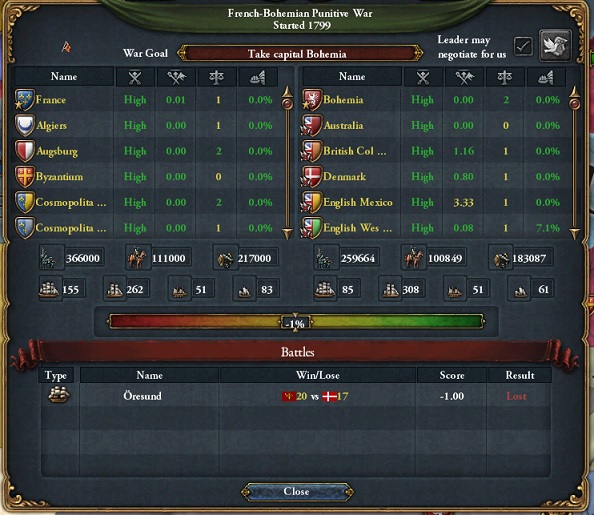 1799年、ハンガリー王国を併合したボヘミア選帝侯国に対しフランス王国はボヘミア懲罰を名目に対ボヘミア=ロシア大同盟を引き連れ宣戦を布告した。この戦争は欧州全体を巻き込む大戦争となり欧州諸国に多大な損害を与えることとなった。海戦ではビザンツ帝国海軍が64のロシア地中海艦隊を撃沈するなど早期に大同盟勢力の優位となっていたが、陸戦では長らく戦局は拮抗していた。しかし1802年ビザンツ=フランス連合軍がボヘミア一帯の占領を終えると連合主力は一斉にロシア国境を越境しロシア帝国軍主力を敗退させた。これによりボヘミア=ロシア連合は降伏した。この戦争によりボヘミア=ロシア連合はハンガリー、スウェーデン、アンスバッハが解放され、ブランデンブルクはその旧領の奪還に成功した。