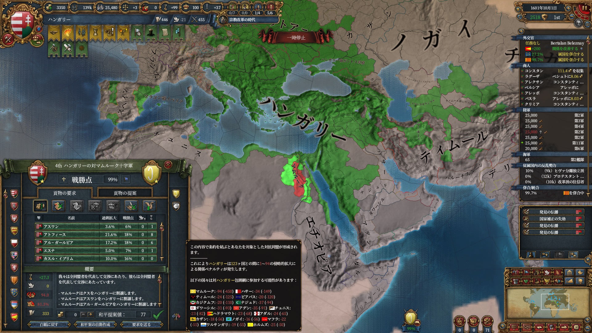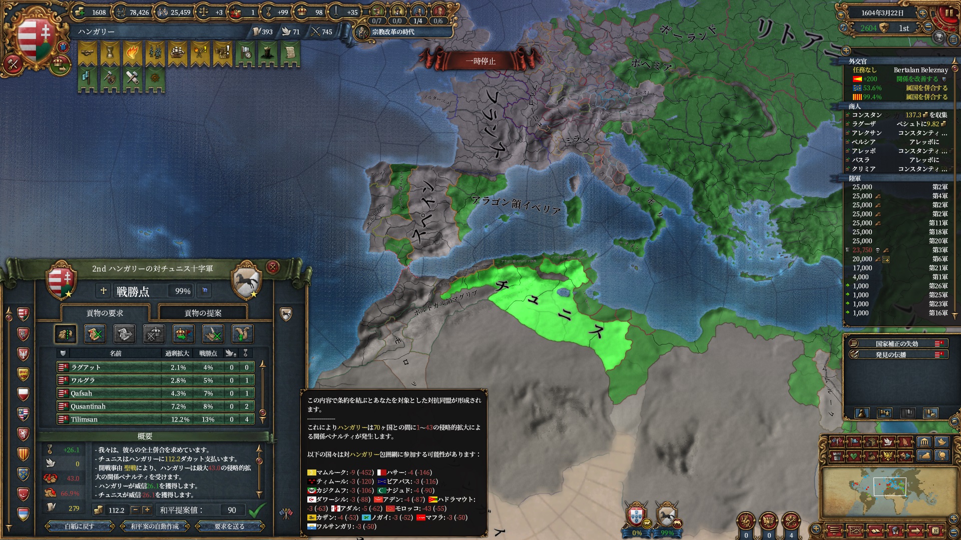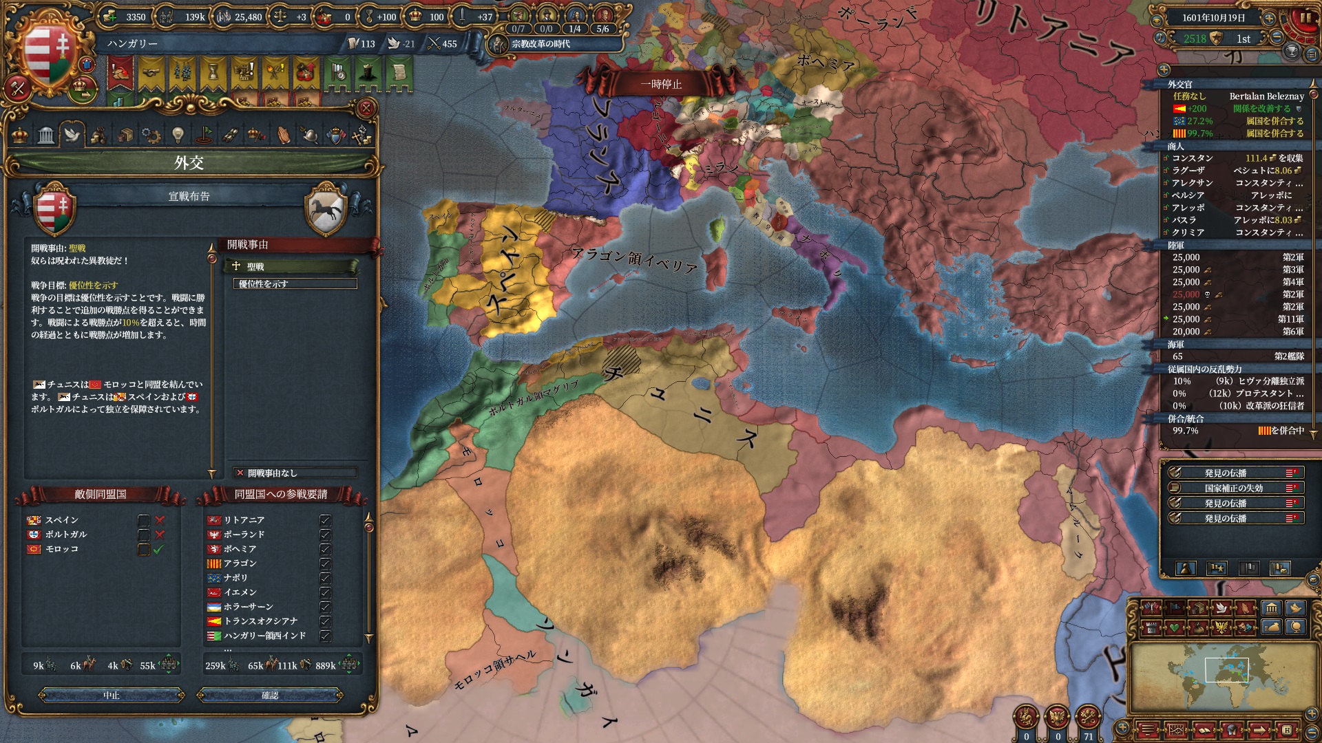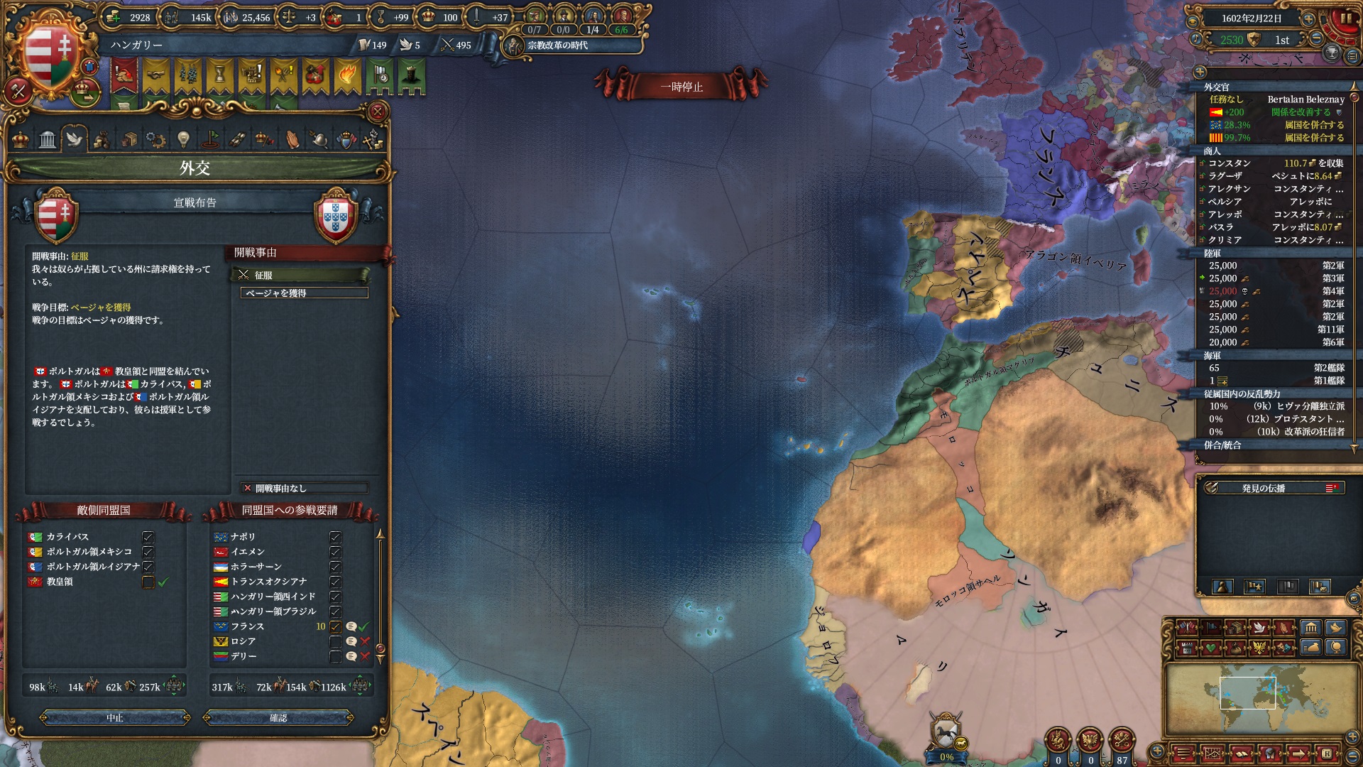 マムルークはもう気にする程ではないですが、スペイン+ポルトガルは結構な軍量になるので停戦明け放置は避けたいところ。