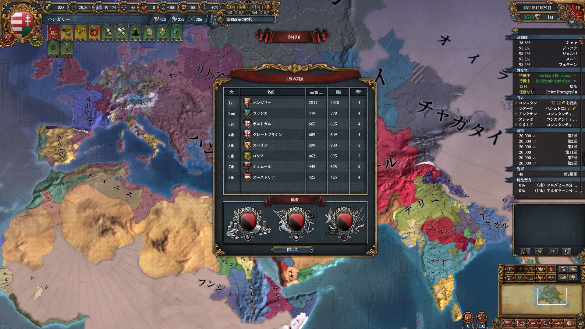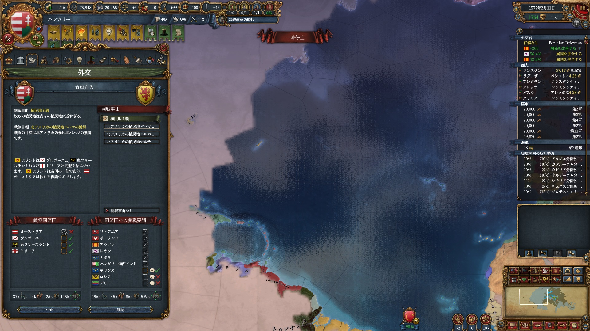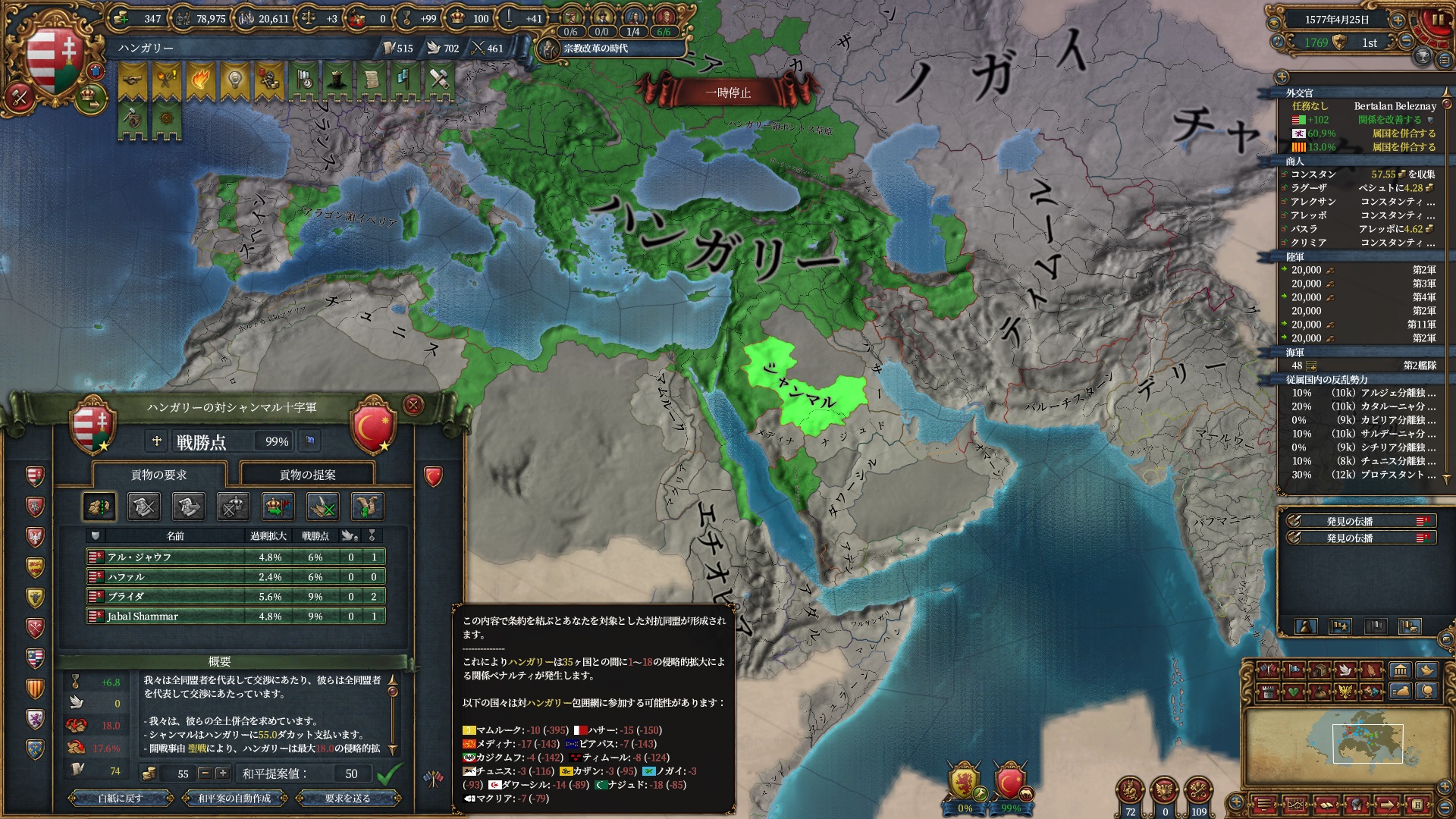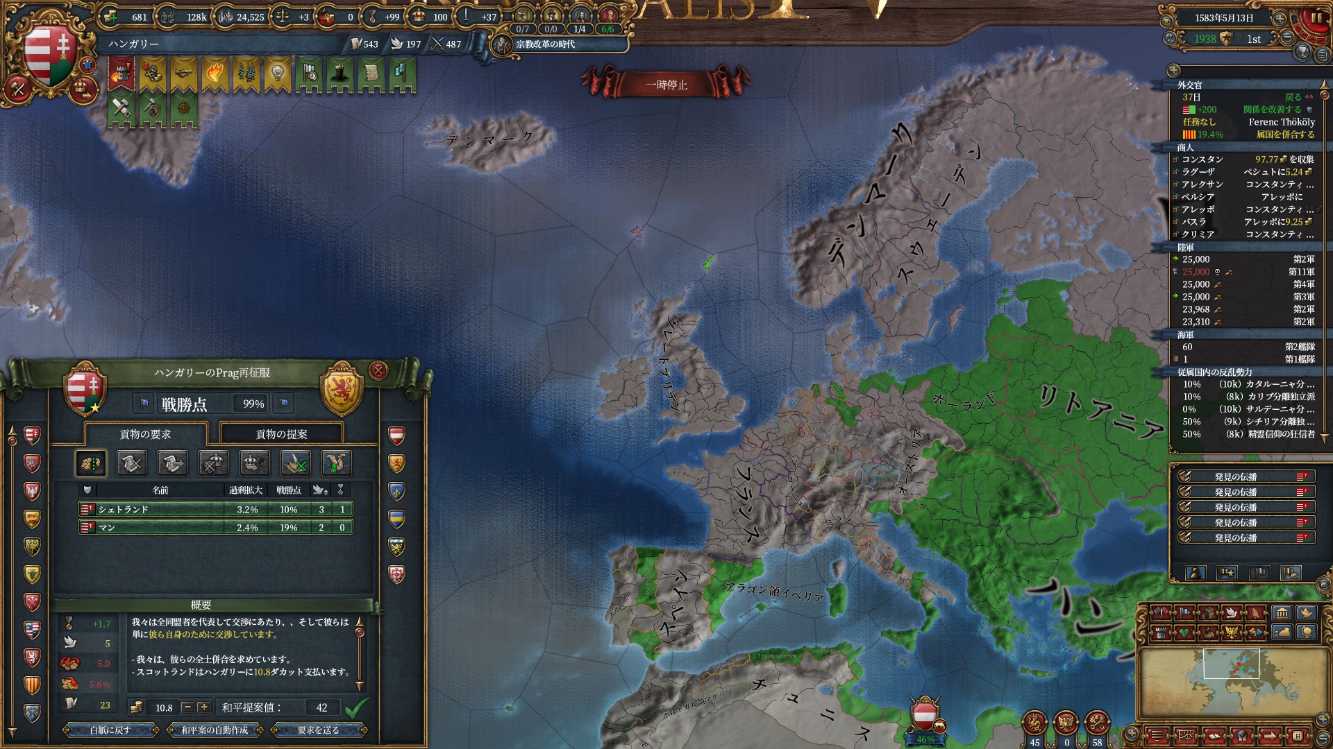 マムルークはもう気にする程ではないですが、スペイン+ポルトガルは結構な軍量になるので停戦明け放置は避けたいところ。