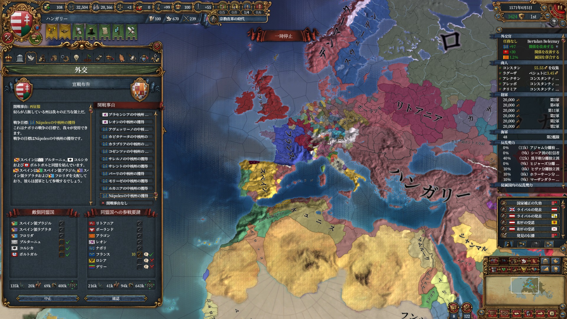 まだまだ続く再征服。ナポリ統合に伴いこちらも属国ナポリを作成して突っ込みます。