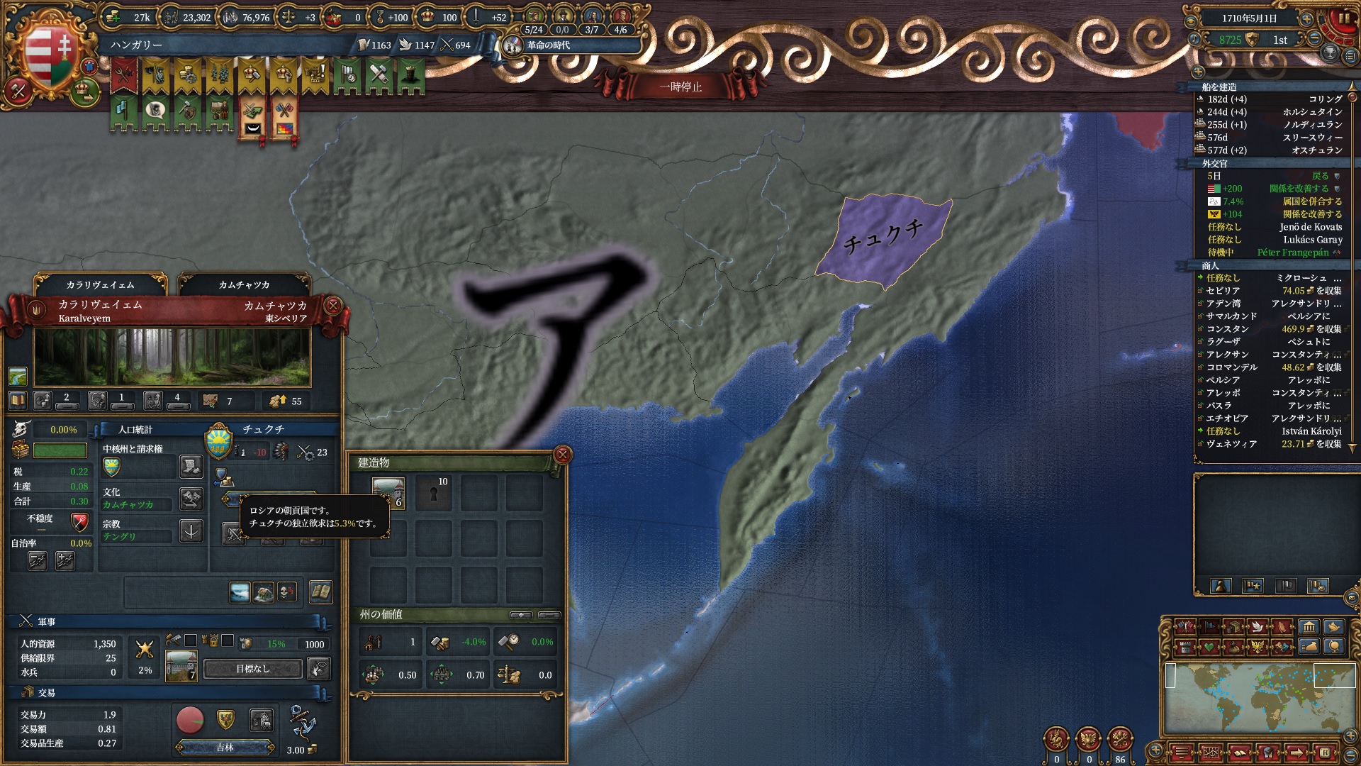 やり慣れてる人は統治効率60%&帝国主義CBの年代に16年もかけてかけてdev1700近く、かつウラル以東は殆どOE0の土地で征服しやすい国相手に中途半端な状態で侵攻して何やってんだってお思いでしょうがその通りです、一応OFの改宗力に期待が出来るのとロシア軍が大分強いので後の戦争は楽が出来そうなとことろは(かろうじて)プラス点です。