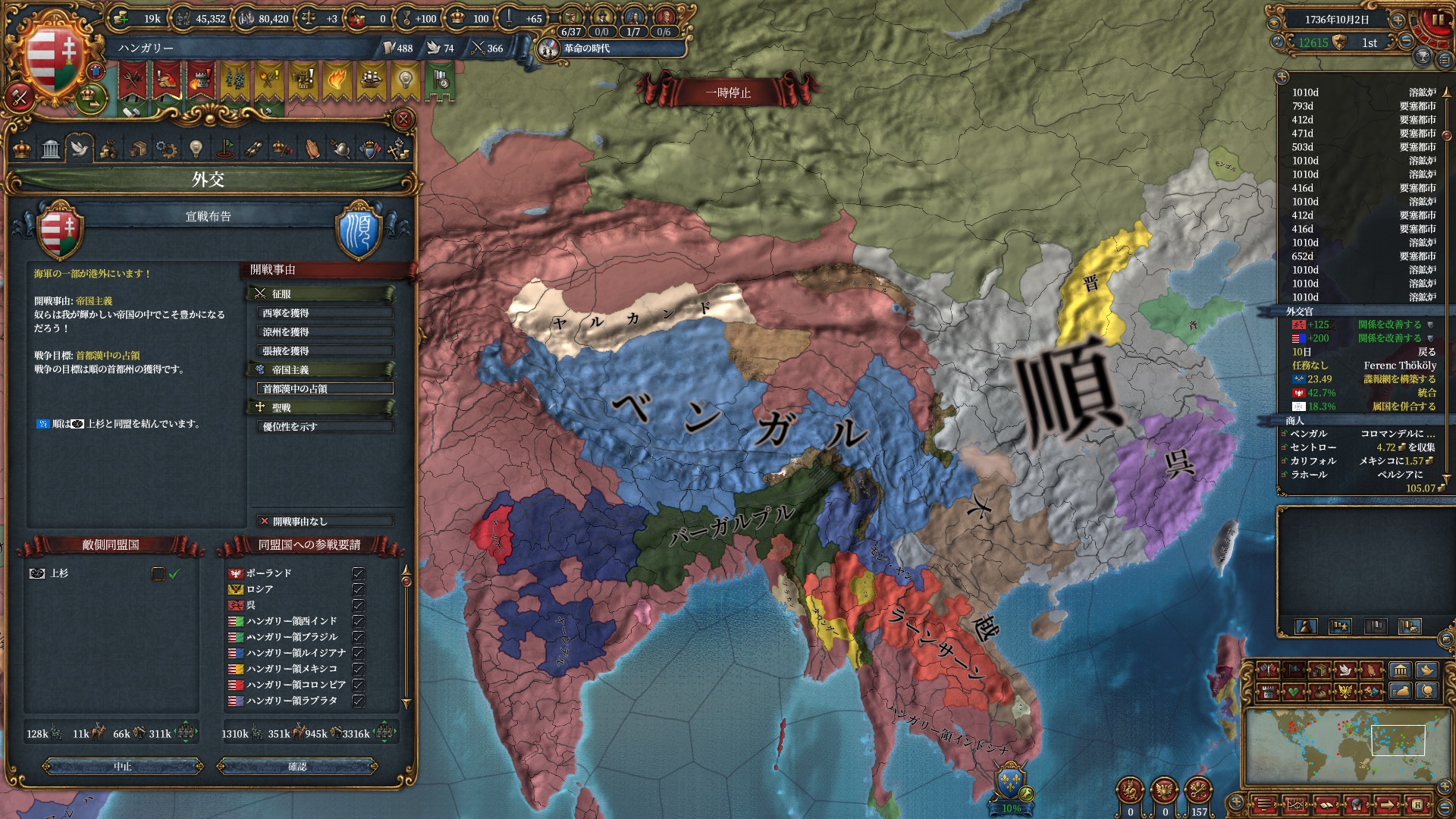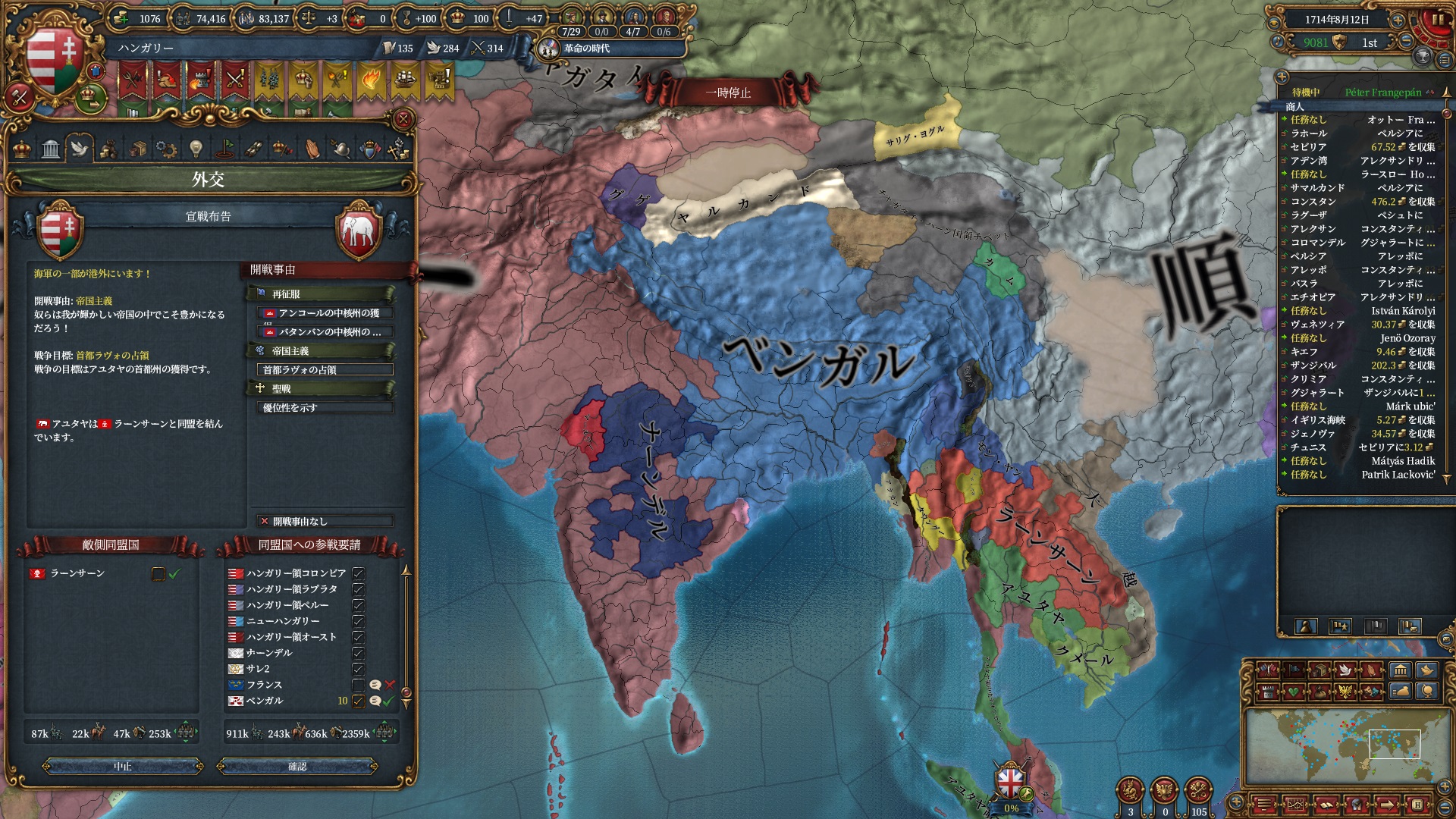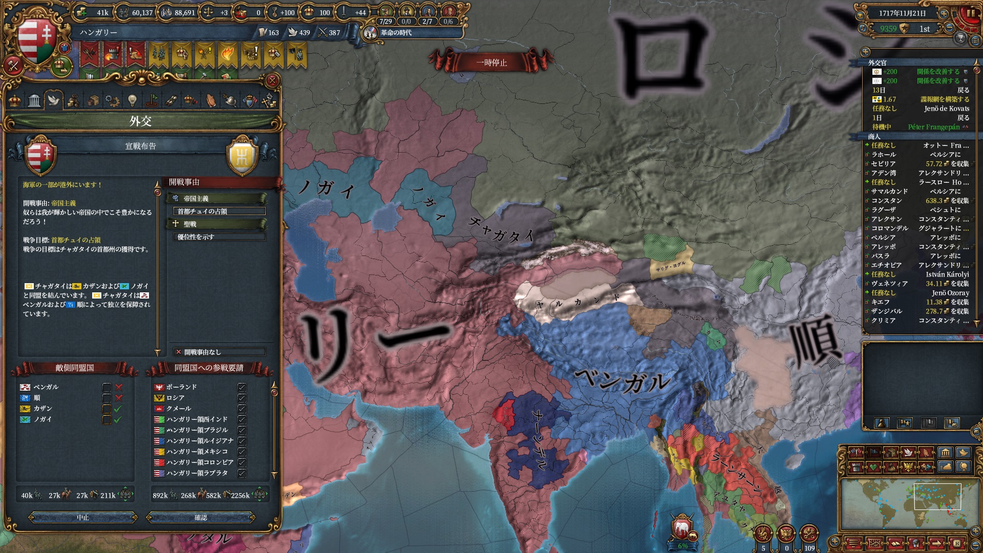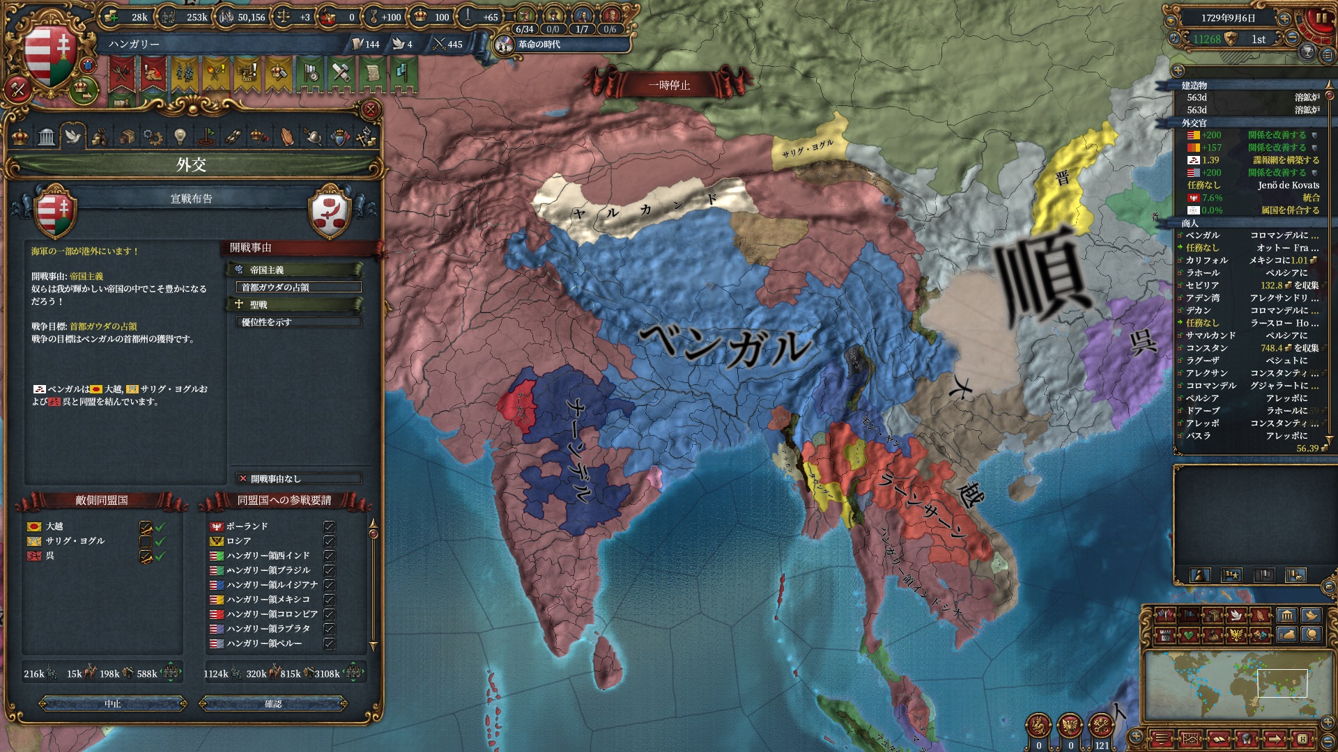 順は中華皇帝で天命0なのでいつでも倒せるため放置で、今メインで戦うべきはイギリス・ブルゴーニュ、そして今はまだ同盟国のフランス・ベンガルでしょう。