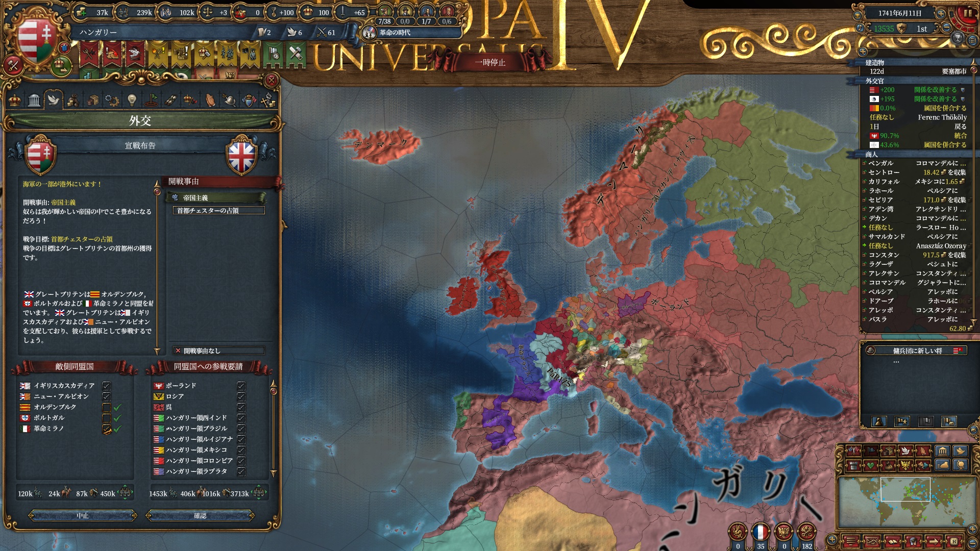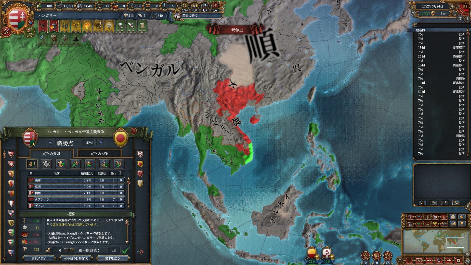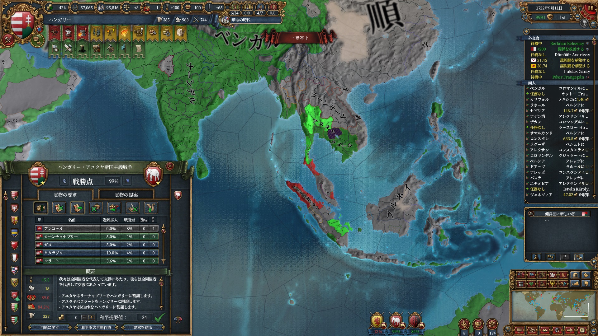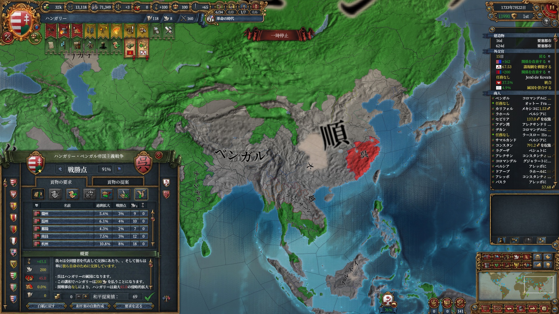 順は中華皇帝で天命0なのでいつでも倒せるため放置で、今メインで戦うべきはイギリス・ブルゴーニュ、そして今はまだ同盟国のフランス・ベンガルでしょう。