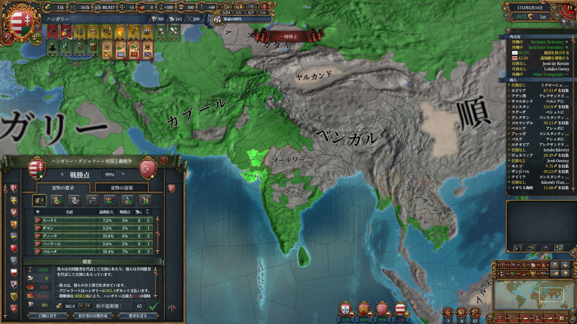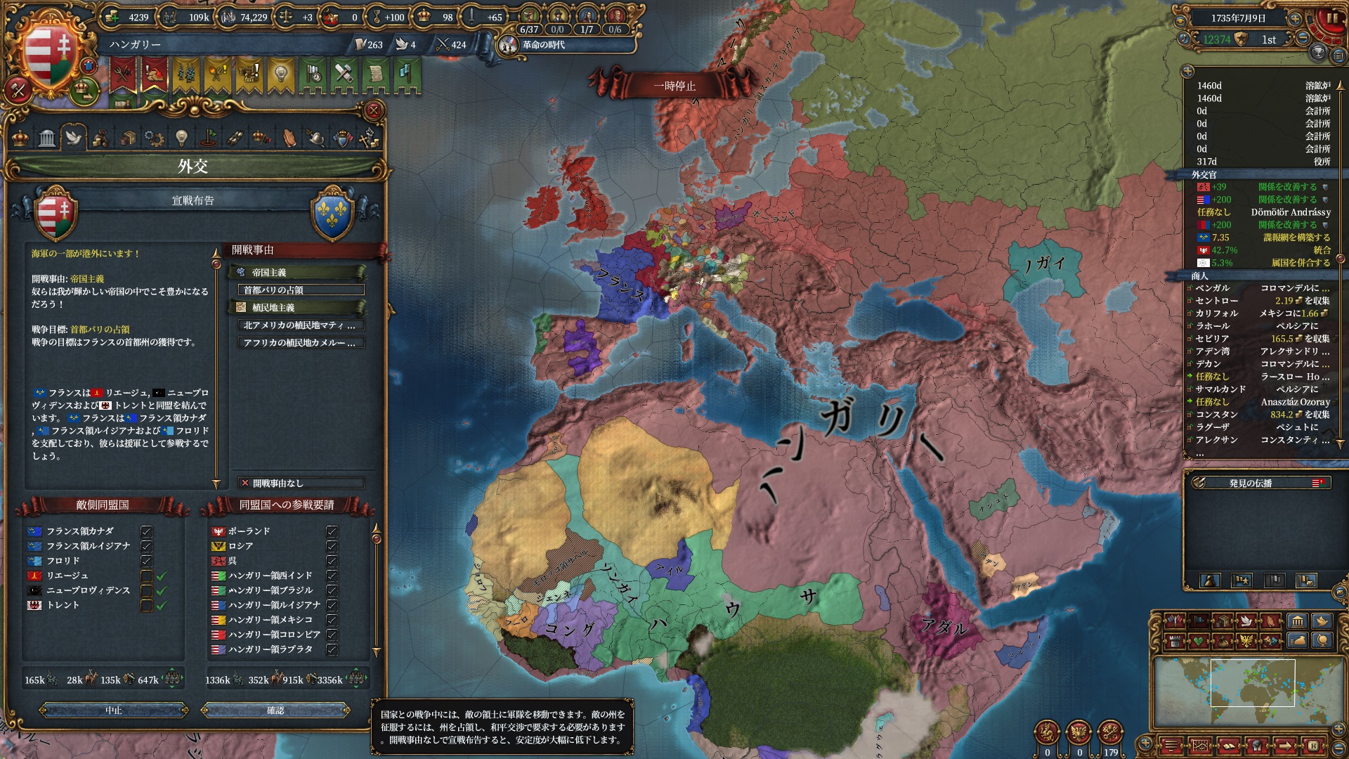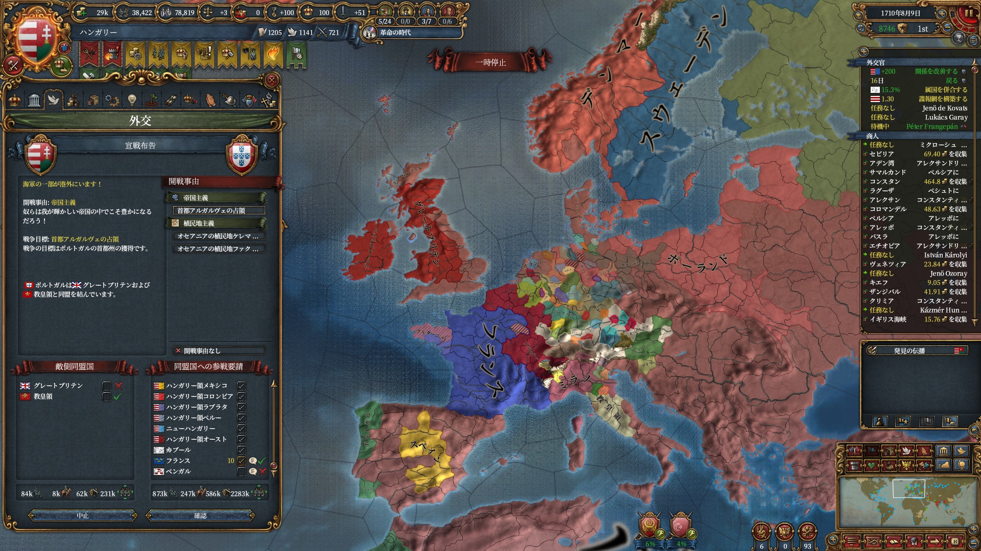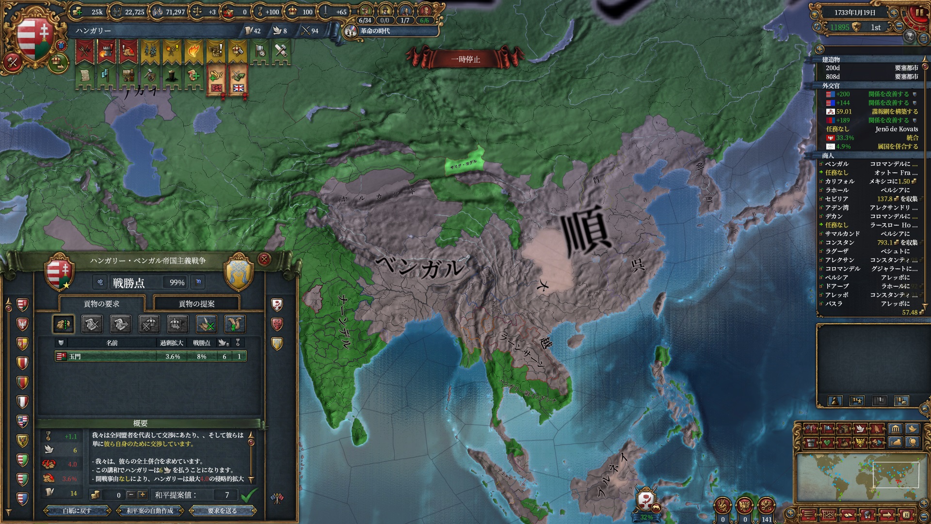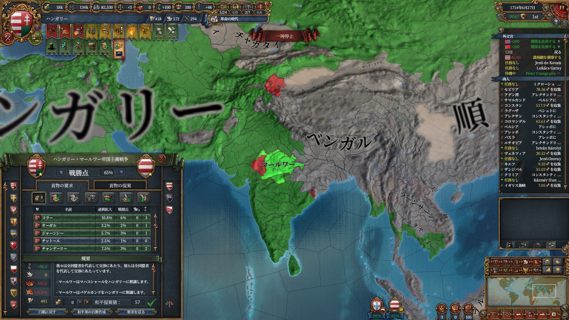順は中華皇帝で天命0なのでいつでも倒せるため放置で、今メインで戦うべきはイギリス・ブルゴーニュ、そして今はまだ同盟国のフランス・ベンガルでしょう。