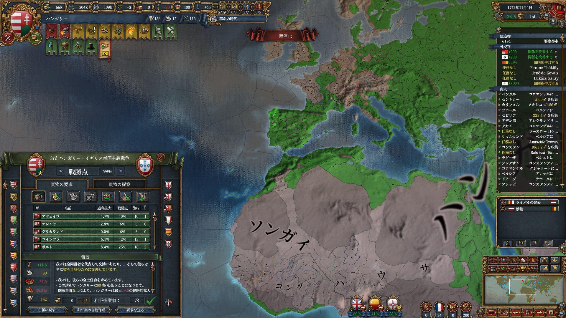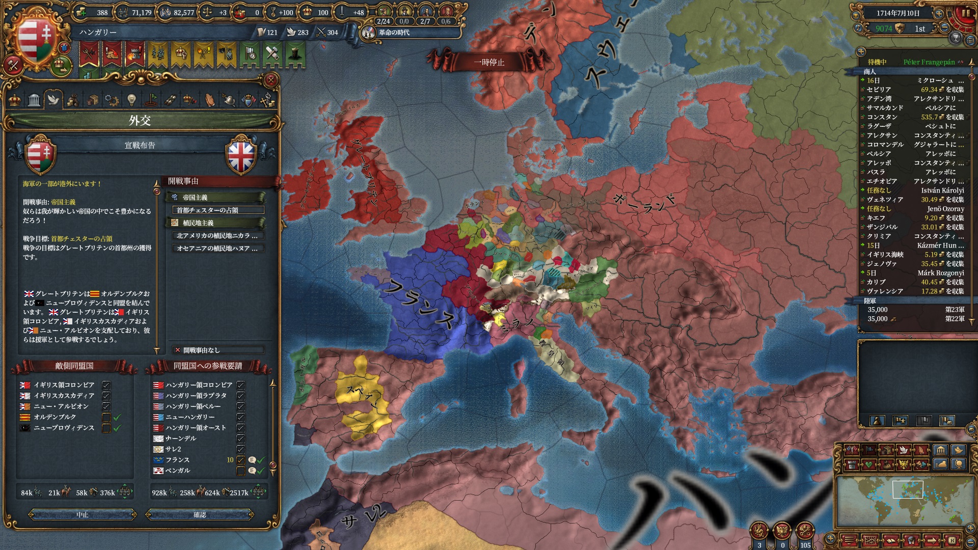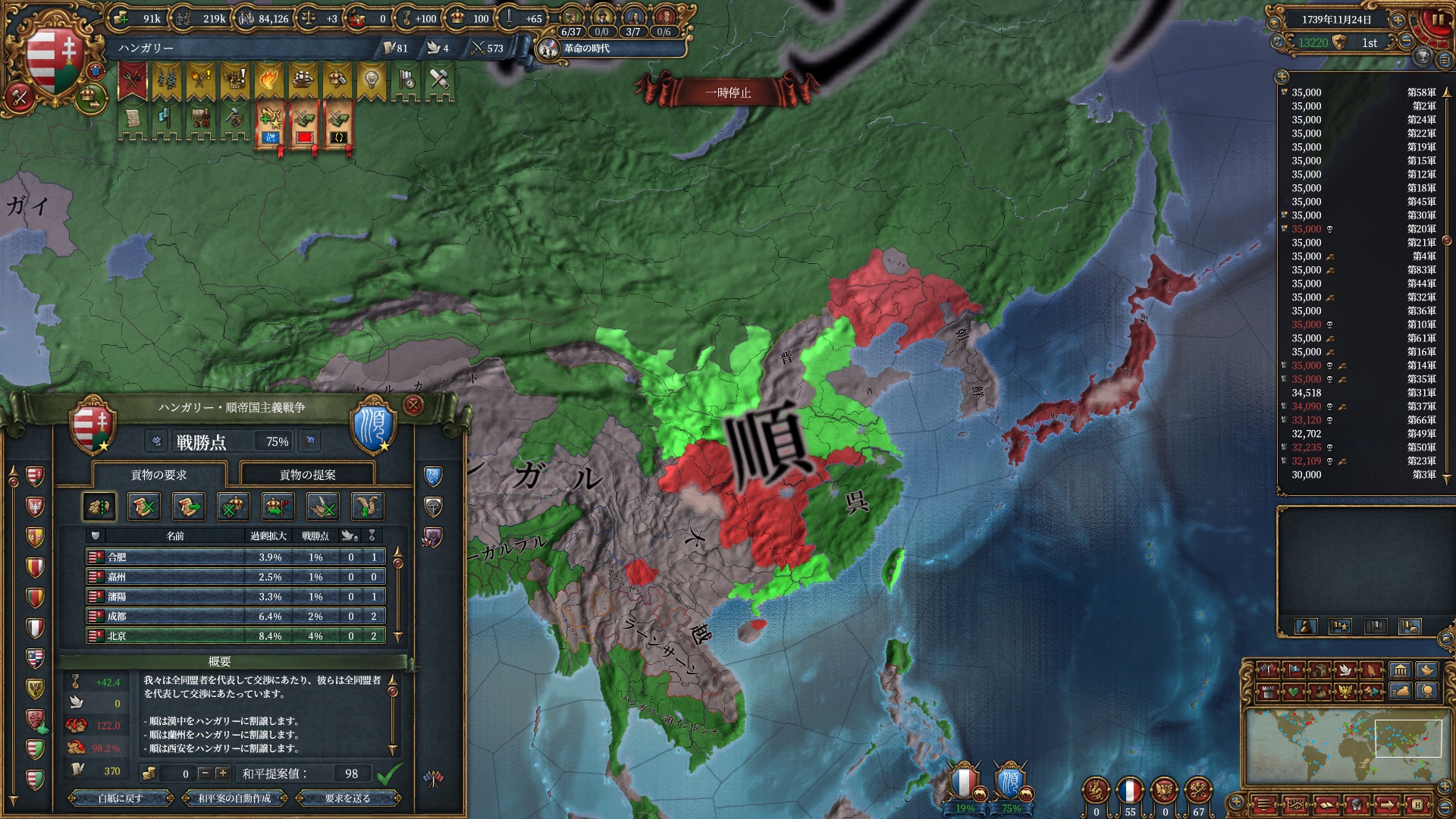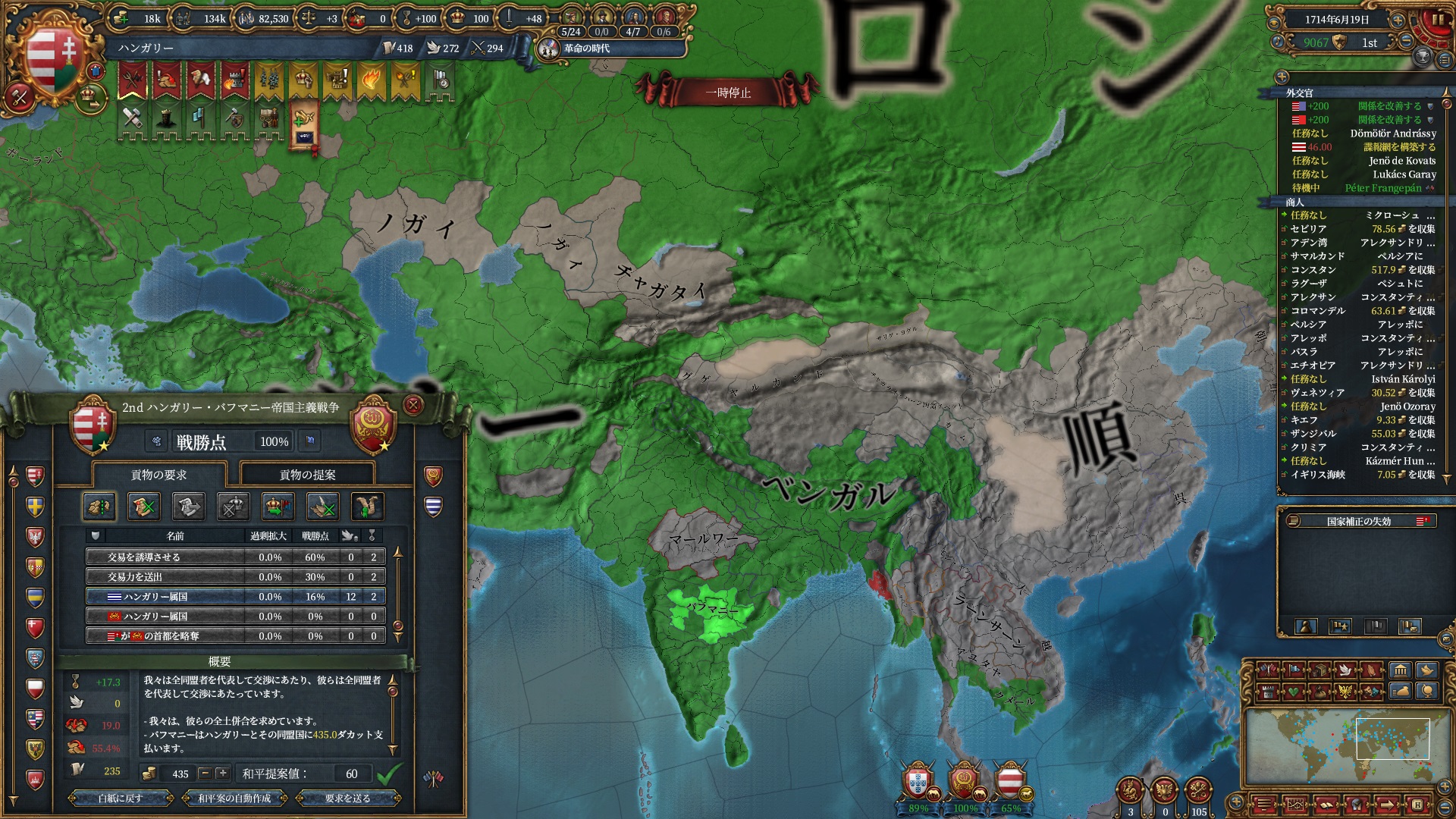 順は中華皇帝で天命0なのでいつでも倒せるため放置で、今メインで戦うべきはイギリス・ブルゴーニュ、そして今はまだ同盟国のフランス・ベンガルでしょう。