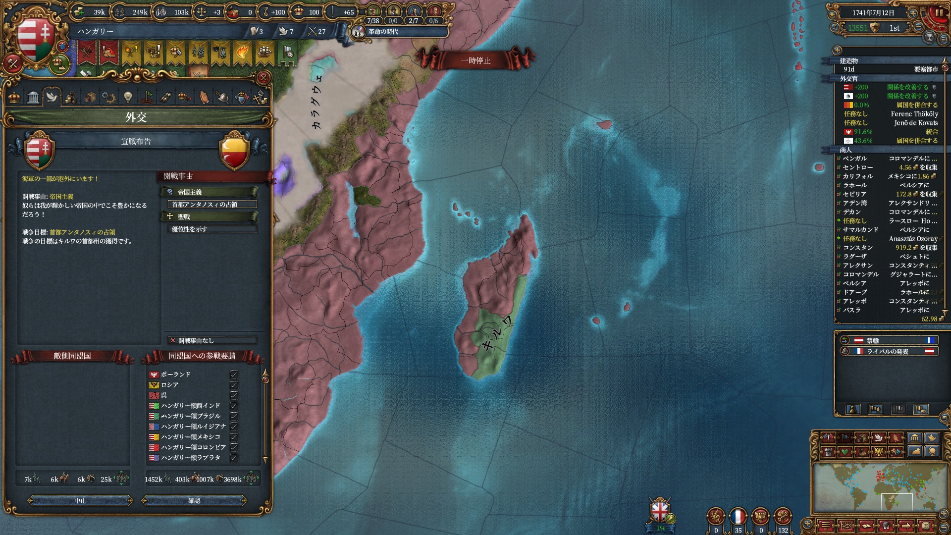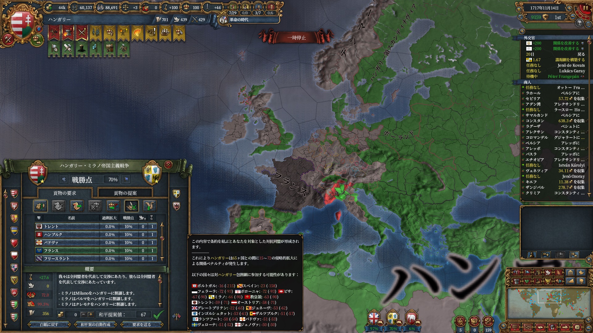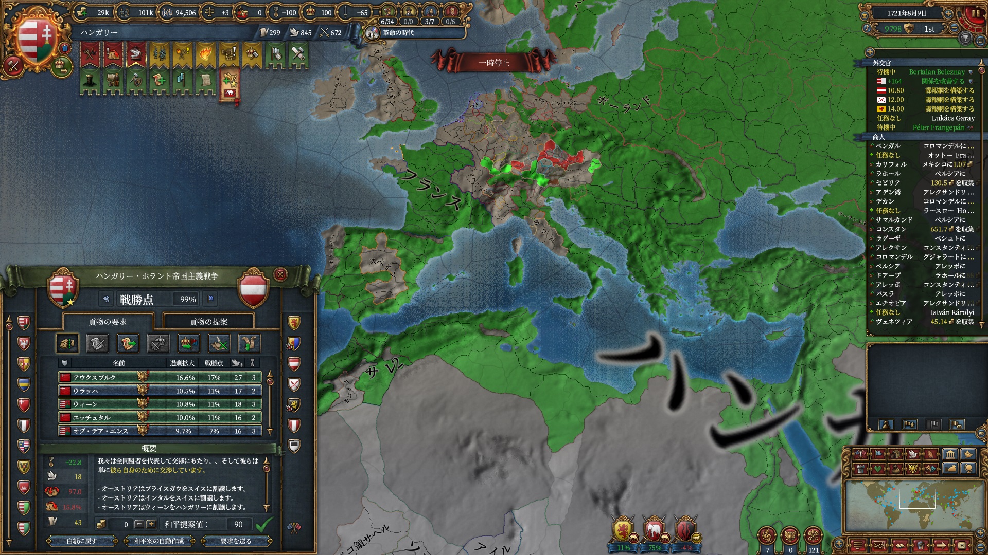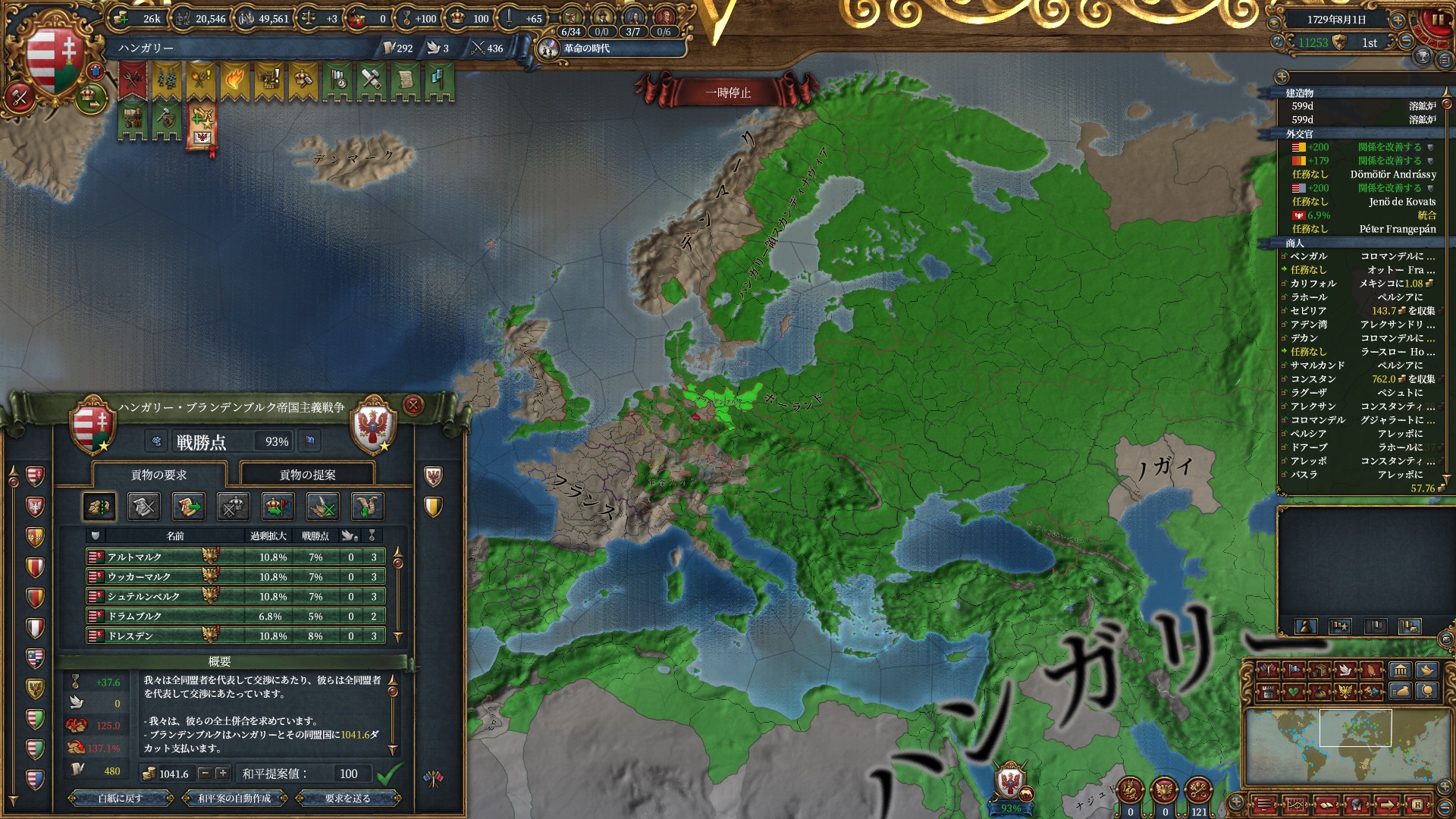かといってポーランド統合後の観点ではハンガリーはそれら属国に対して全力でAEを飛ばしているため凄いマイナスopinionになっており、外交併合が行えない事が確定。