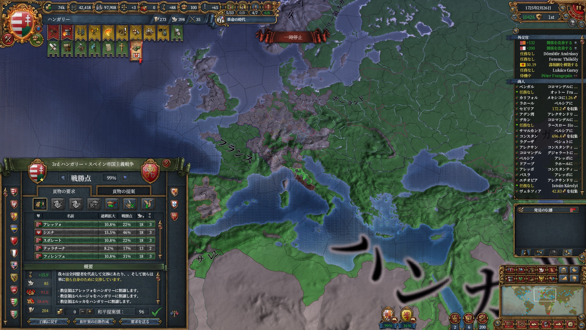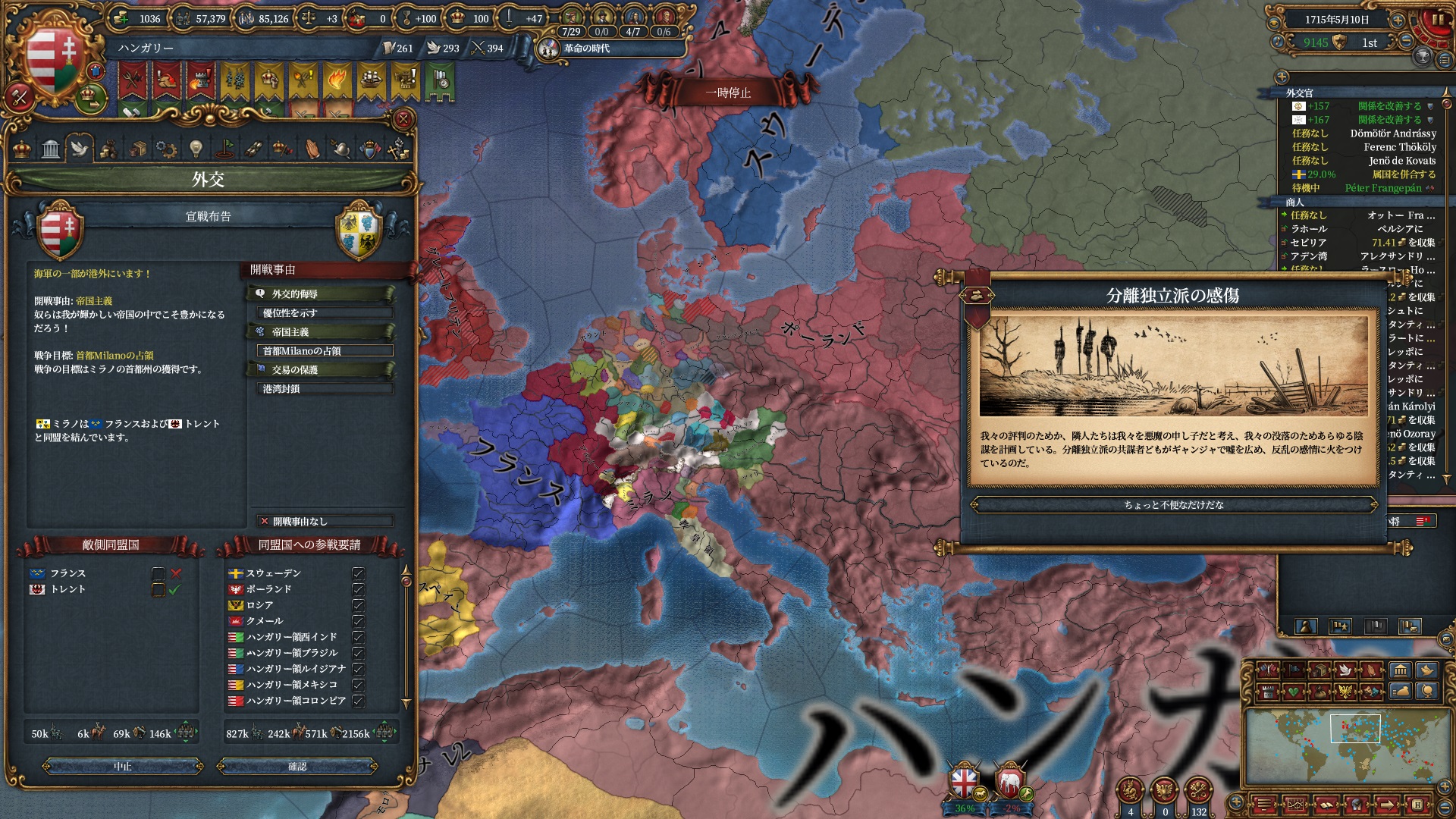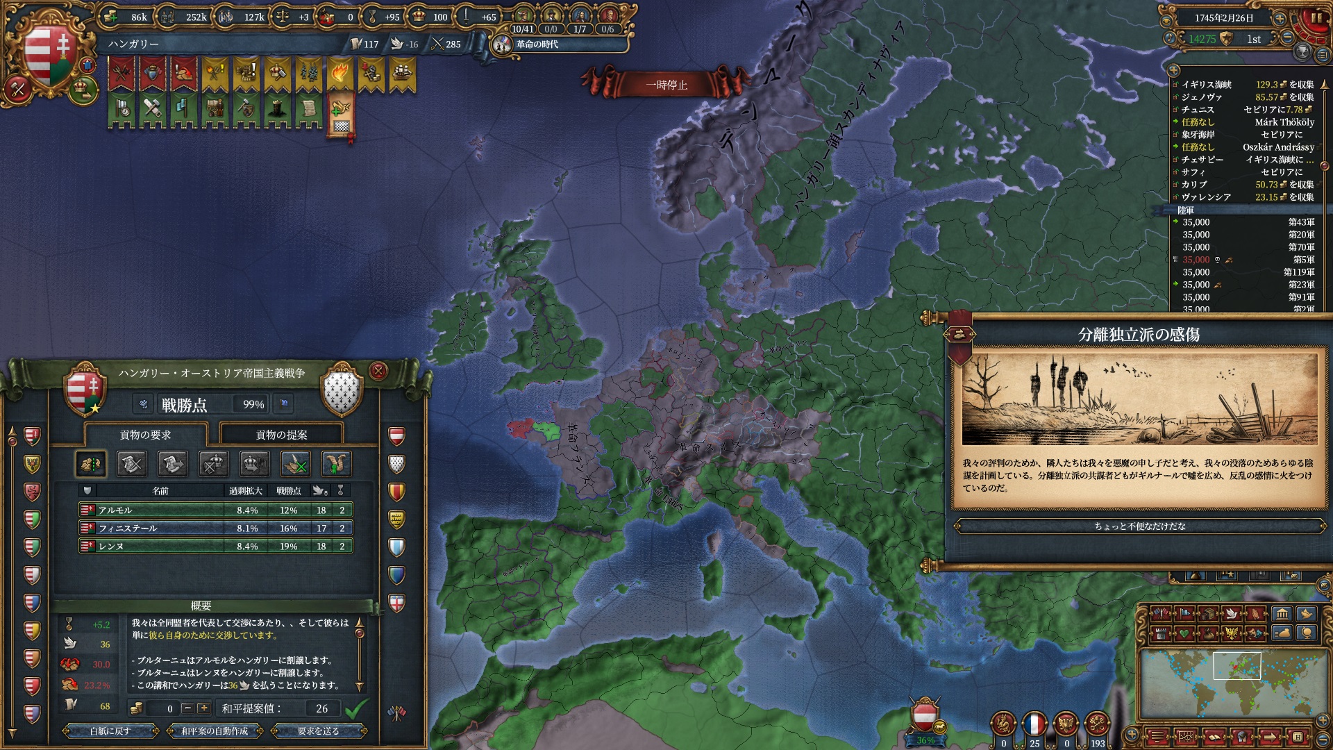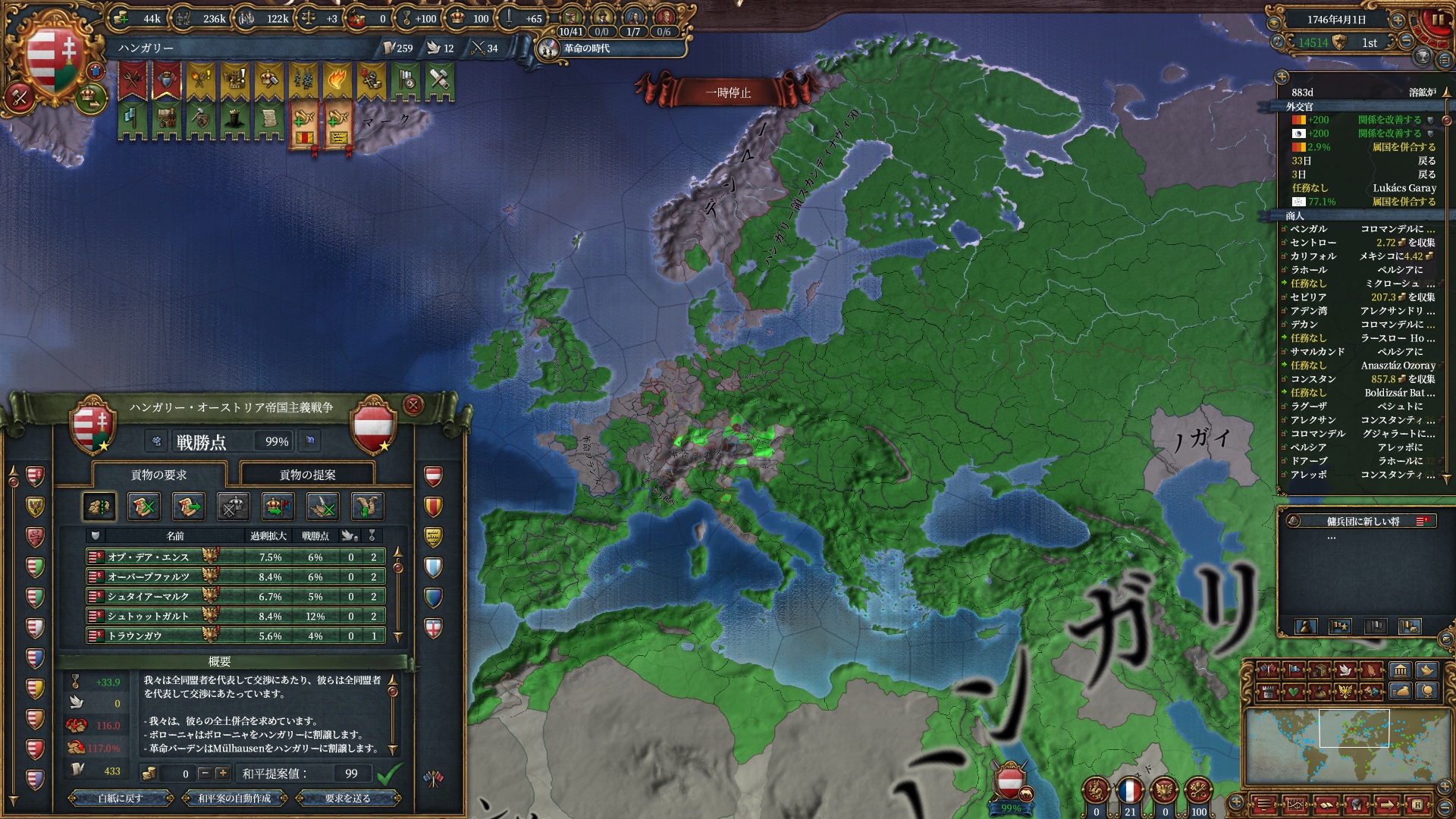 かといってポーランド統合後の観点ではハンガリーはそれら属国に対して全力でAEを飛ばしているため凄いマイナスopinionになっており、外交併合が行えない事が確定。