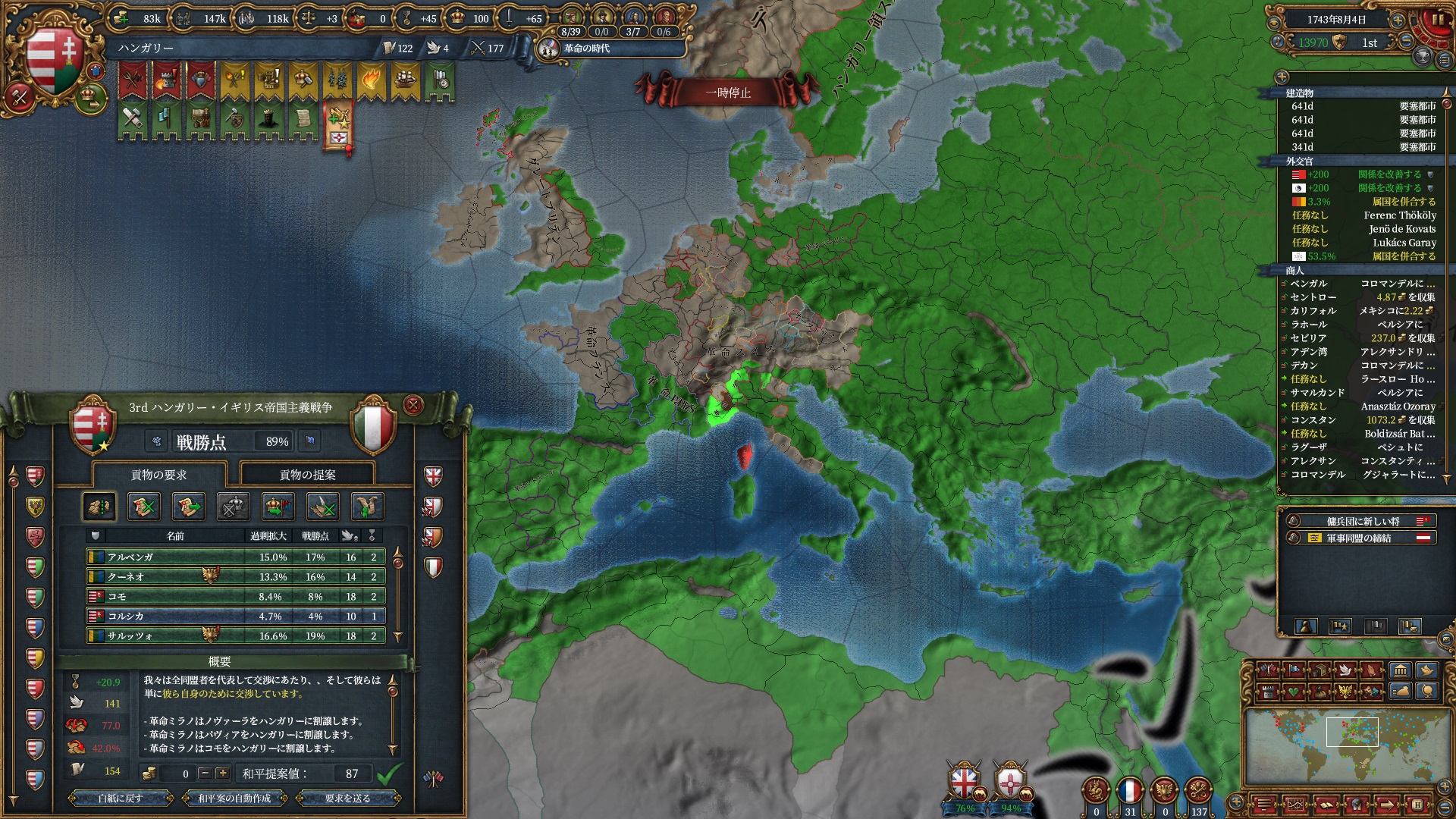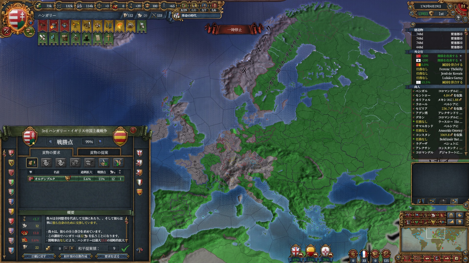 早速統治効率が55%に下がってしまい、ロシア戦の傷が癒えずMPも全然ありませんが戦争再開です。