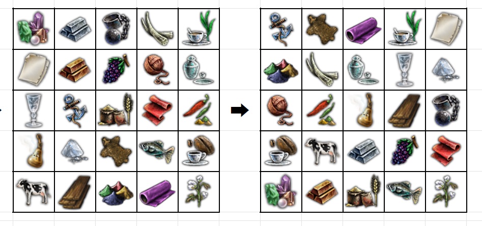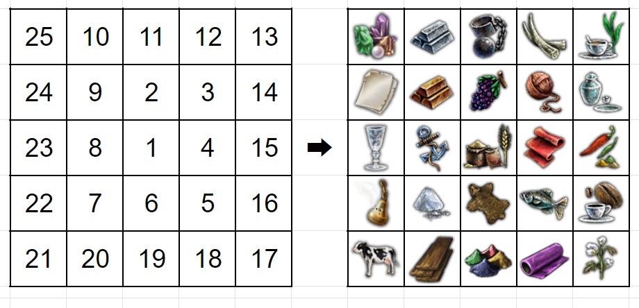 2,台帳41番の交易品の並び方を参考にリスト一番上をビンゴの1の箇所に割り振っていく