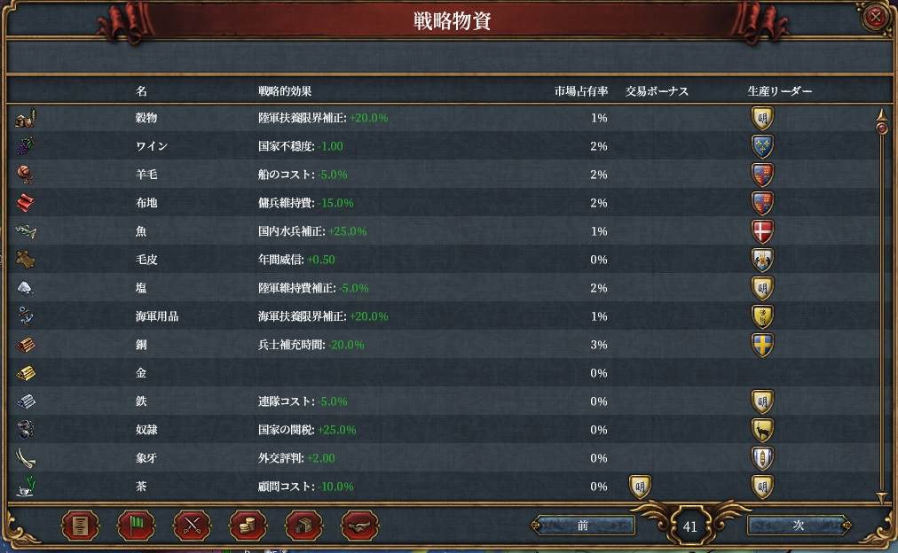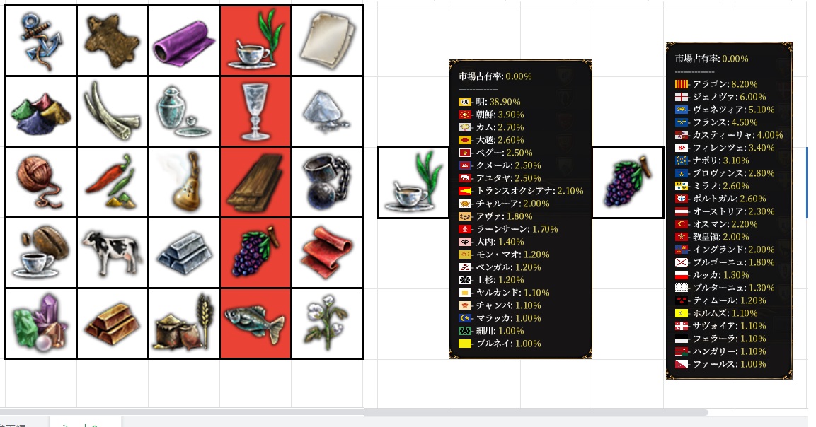 ※台帳41番には30品あったので、25品にするために金・クローブ・新大陸系3つ(砂糖・タバコ・ココア)は順番抜かします。