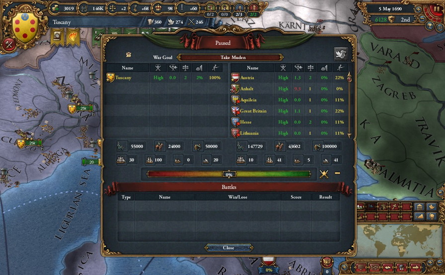 参戦拒否したのに、相手側に嫌いな国でもあったのか、再同盟したら参戦してくれるAustriaとBohemia。