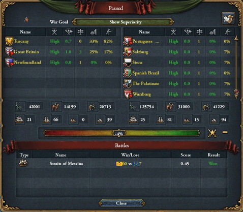 そしてSpainとPortugalの海軍を執拗に攻撃したり、敵軍主力(France・Spain)の人的資源を掘削した結果。