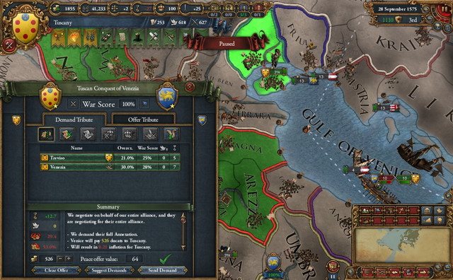 勝利。Pisaの東にあるSienaやイベリアのBarcelonaなど計三州を貰う。