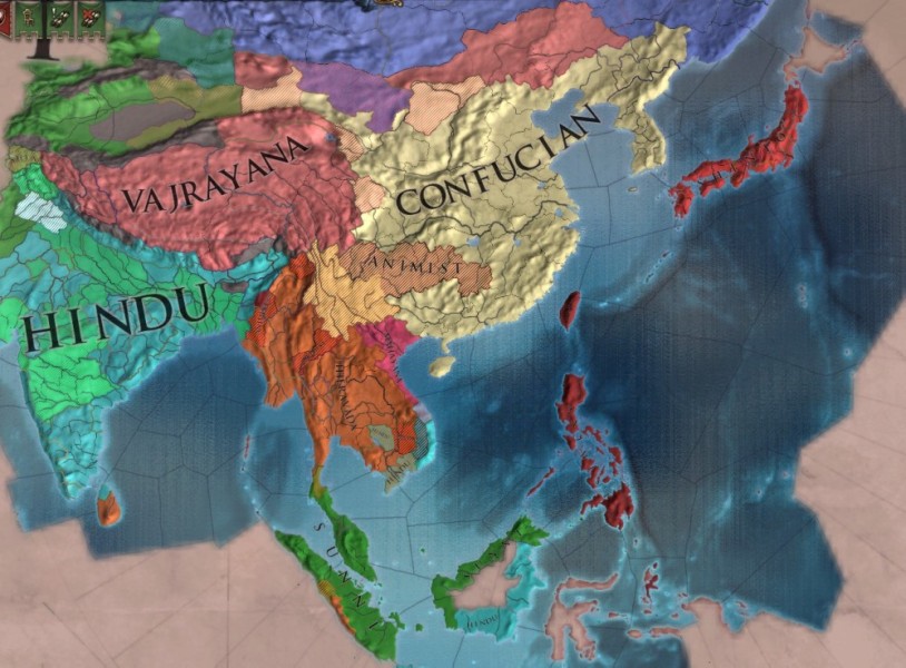1444年時点では中国大陸および朝鮮半島、日本、インドシナ、チベットおよび西域、そしてスマトラ、セイロンの一部がこれらの宗教を信仰しています。