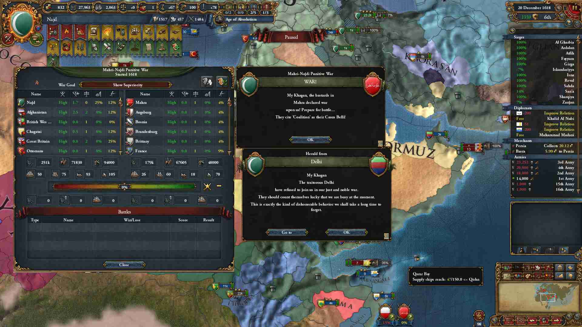 | 1647/03 | Khorasanに宣戦布告 | Transoxiana・Sirhindを共戦指定→Kazanも参戦 | 開戦前にSirhindに最後の奉公を求めた |