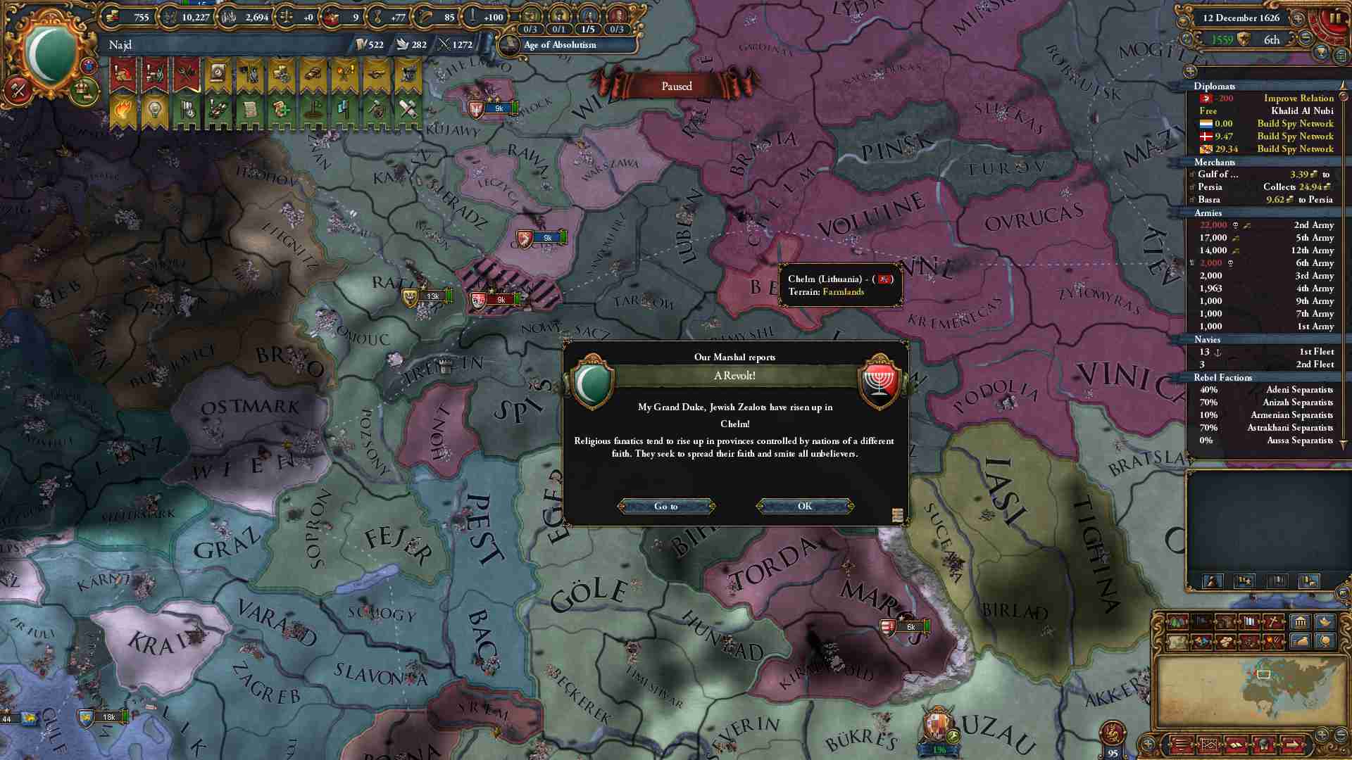 1626年12月 属国ユダヤ狂信者反乱計画失敗の瞬間。ダイアログだけで部隊が出現しなかった