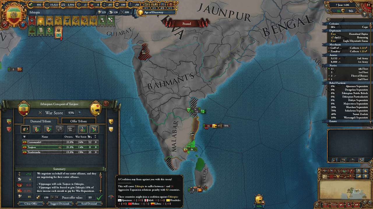 外交枠が空いたのでBahmanis戦のためにBengalと同盟