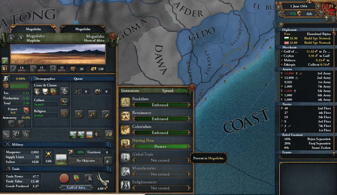 Bahmanis領占領が進み、熱帯木材の交易ボーナス(州開発コスト-5%)を得たのでMOGADISHUを開発