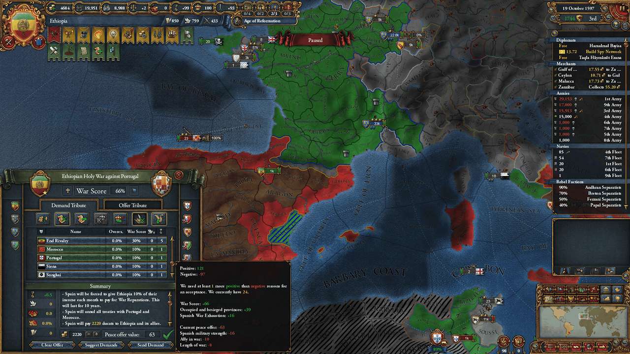 Ottomansが降りたので終戦。ジブラルタル海峡の両岸とAragon、Naplesの種地を獲得
